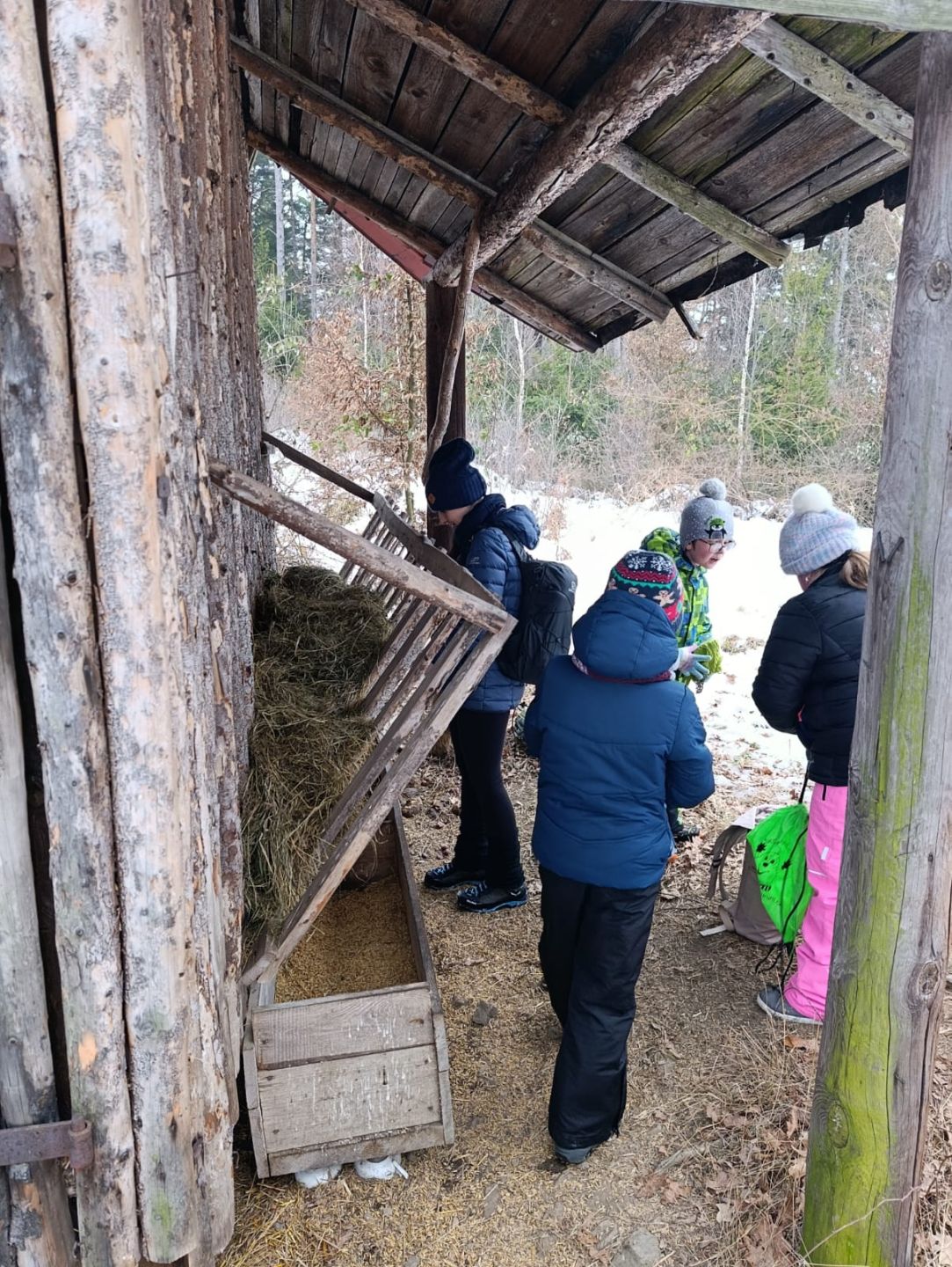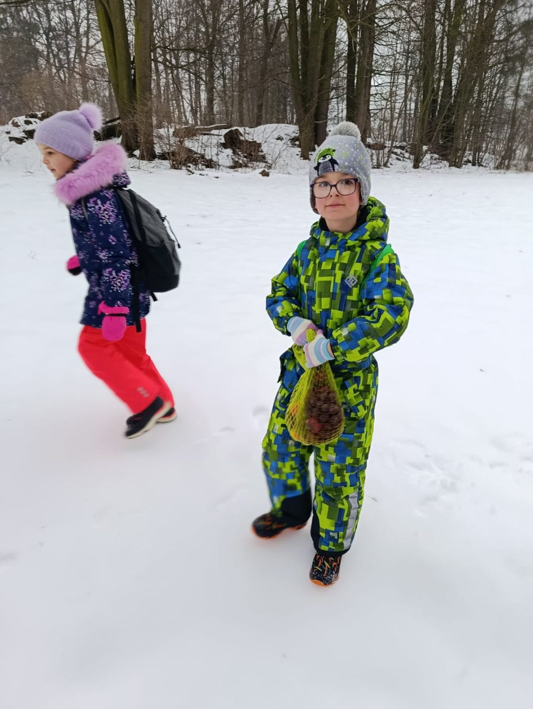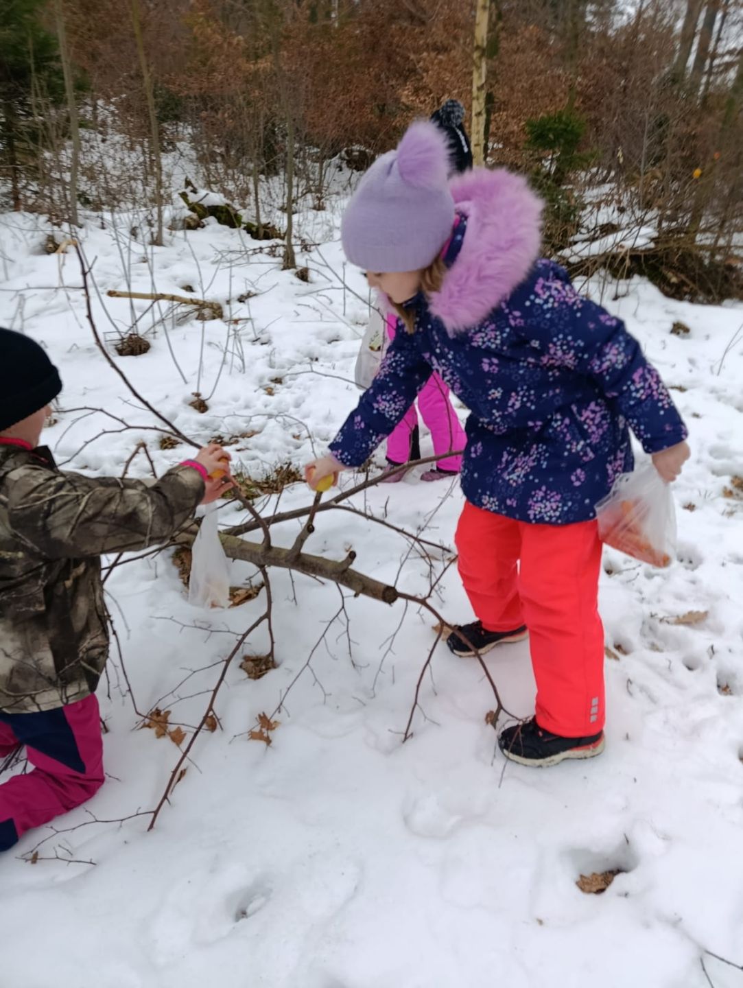 Děti myslely na zvířátka v lese, a tak jim přinesly do krmelce kaštany, které nasbíraly u školy a také mrkev, jablka a ovesné vločky. Zároveň si udělaly hezkou procházku zimní krajinou ve vzdáleném okolí školy.