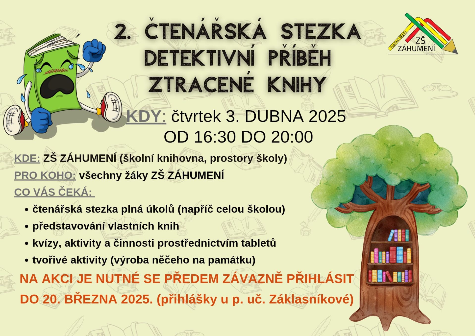 Čtenářská stezka již podruhé. Přihlášky, prosíme, odevzdávat paní učitelce Záklasníkové do 20. 3. 2025.