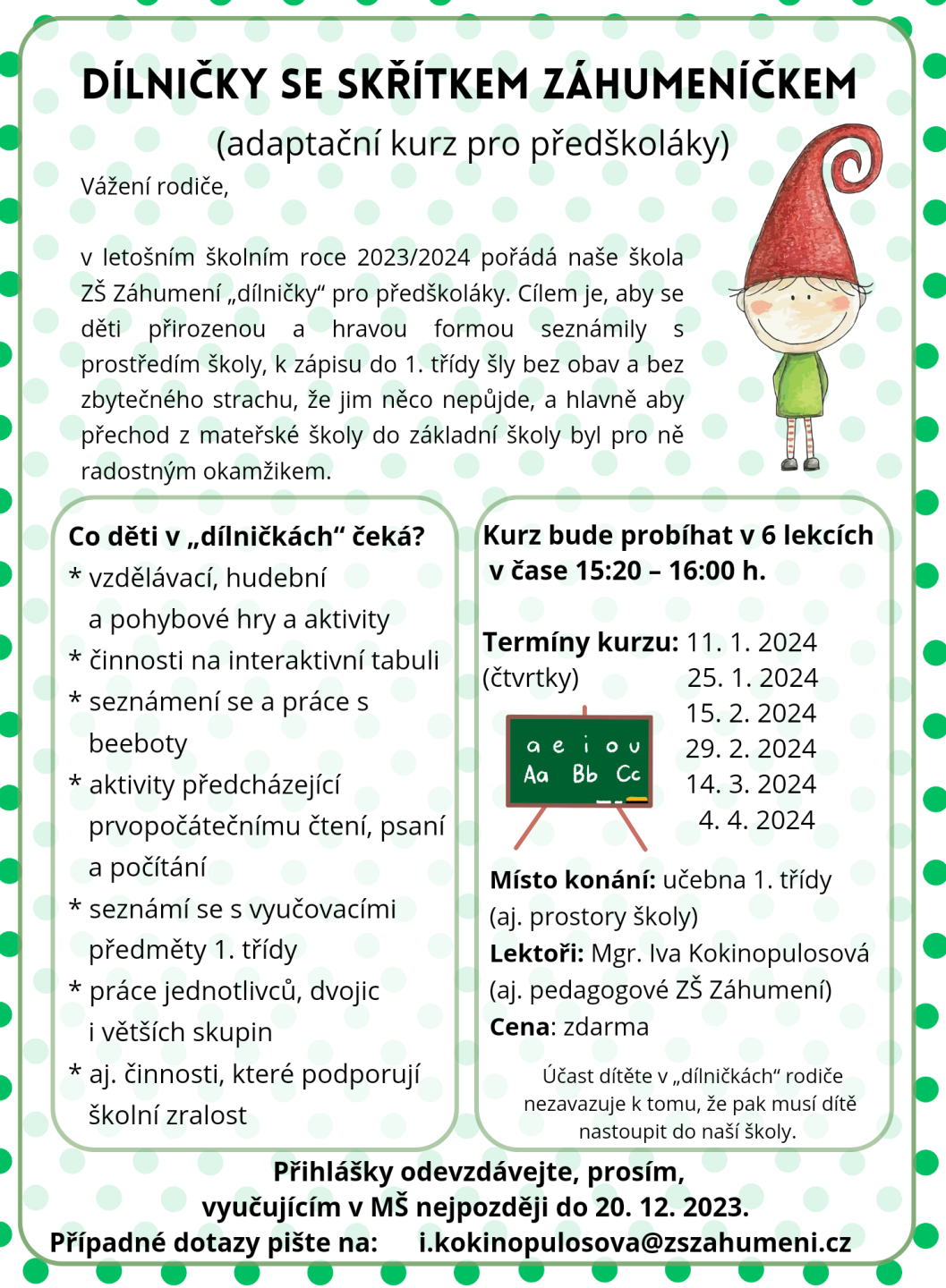 Zveme všechny předškoláky k seznámení s naší školou prostřednictvím adaptačních dílniček se skřítkem Záhumeníčkem, viz plakát.