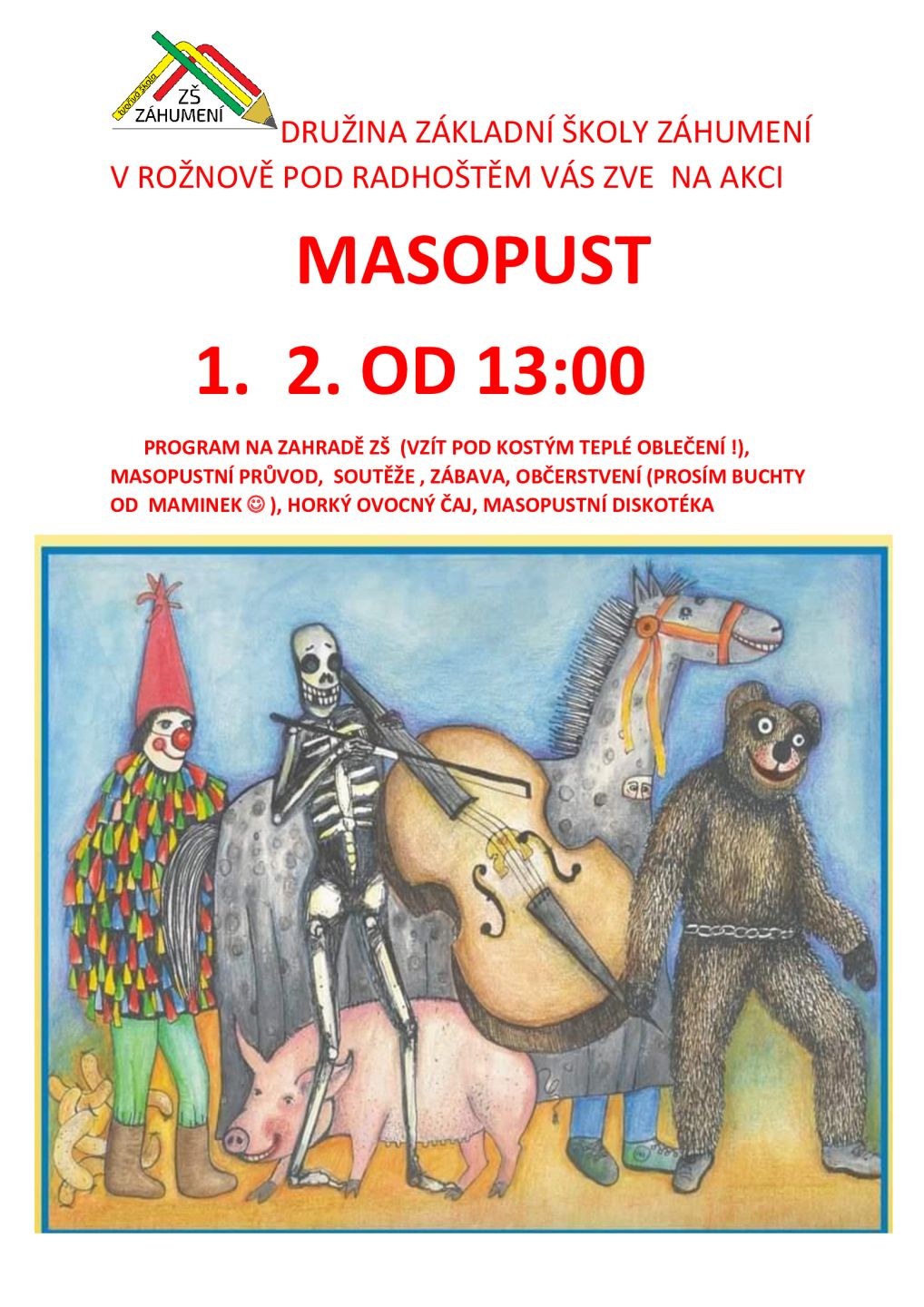 Družina ZŠ Záhumení Vás srdečně zve 1. 2. od 13:00 hod. na Masopust na školní zahradě (v případě špatného počasí v tělocvičně). Děti si přinesou, nebo vyrobí masky a udělají masopustní průvod. Zazní lidové písně v podání paní Lucie Vašínové na klavír a žačky 3. třídy Emilie Lapuníkové na harmoniku, budou probíhat soutěže a rodiče připraví občerstvení.
