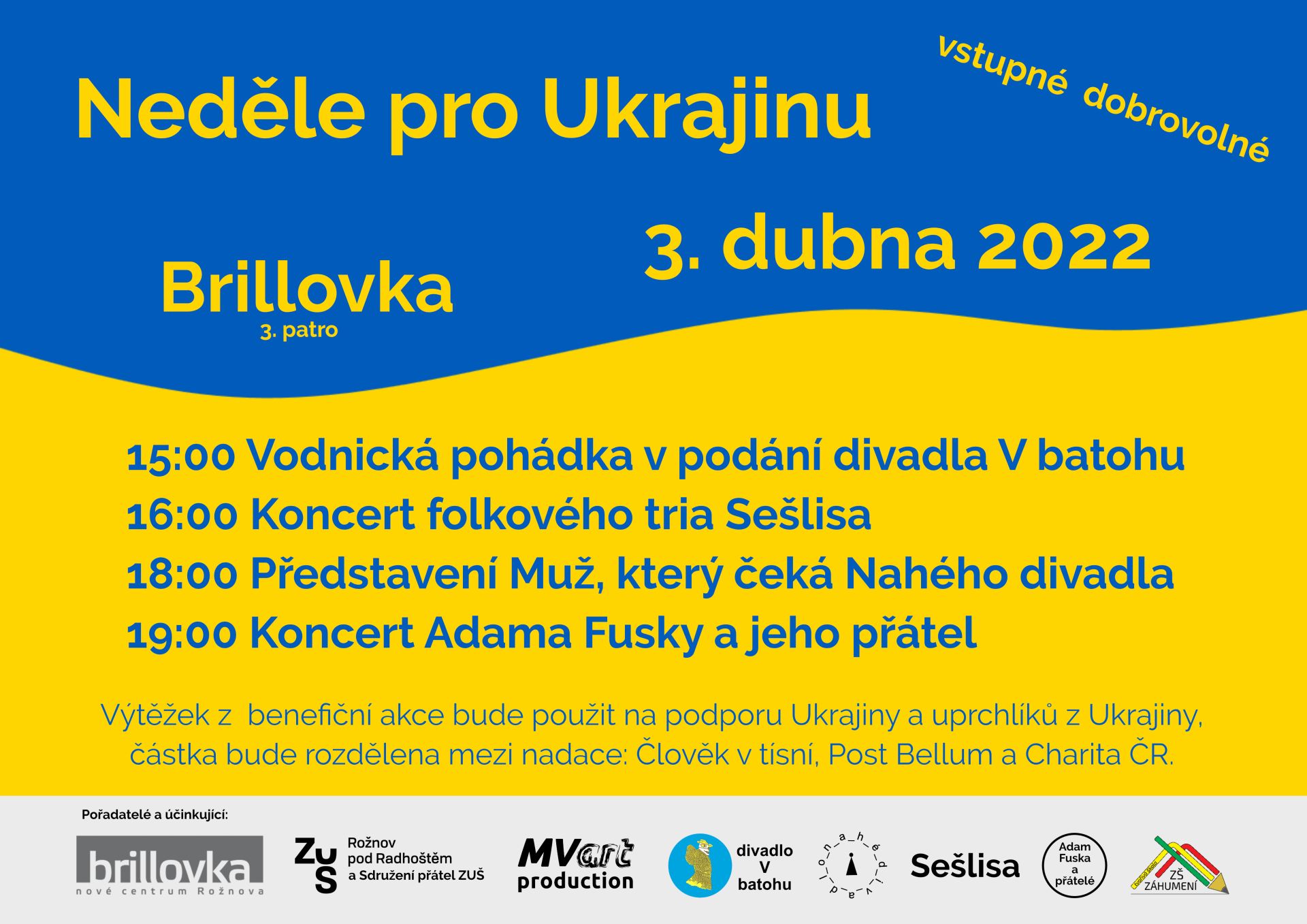 Neděle pro Ukrajinu v Rožnově pod Radhoštěm se koná 3. 4. 2022 v sále Brillovka - benefiční akce pro těžce zkoušený národ agresivní válkou, jejíž výtěžek jde na transparentní účet humanitárních společností. Prosím přijďte podpořit Ukrajinu a pokud znáte, ubytujete ukrajinské děti, ženy, seniory, nemocné, handicapované apod., přiveďte je s sebou, ať vidí, že proti zbraním stojí písně, hudební nástroje, múzy, divadlo, láska, pravda a solidarita, které mohou vyhrát nad agresí, lží a nenávistí. Rád bych poděkoval za logistickou i mediální podporu Agentuře MK spol. s.r.o v Rožnově p. R., TKA agentuře Rožnov p. R. , MV ART PRODUCTION, ZUŠ Rožnov p. R. a ZŠ Záhumení Rožnov p. R.