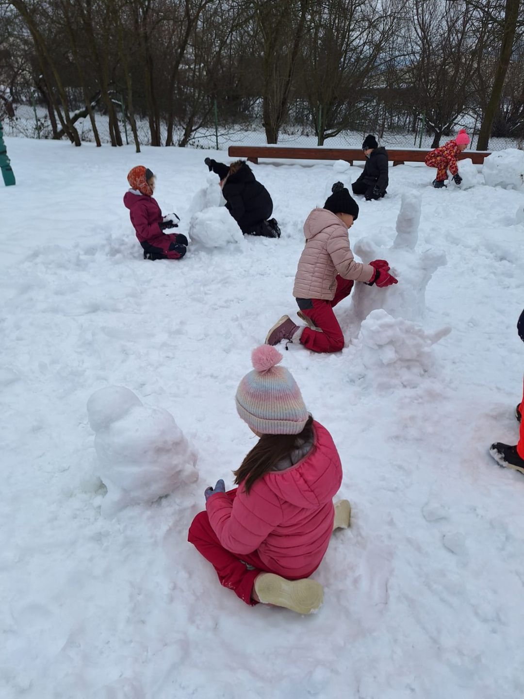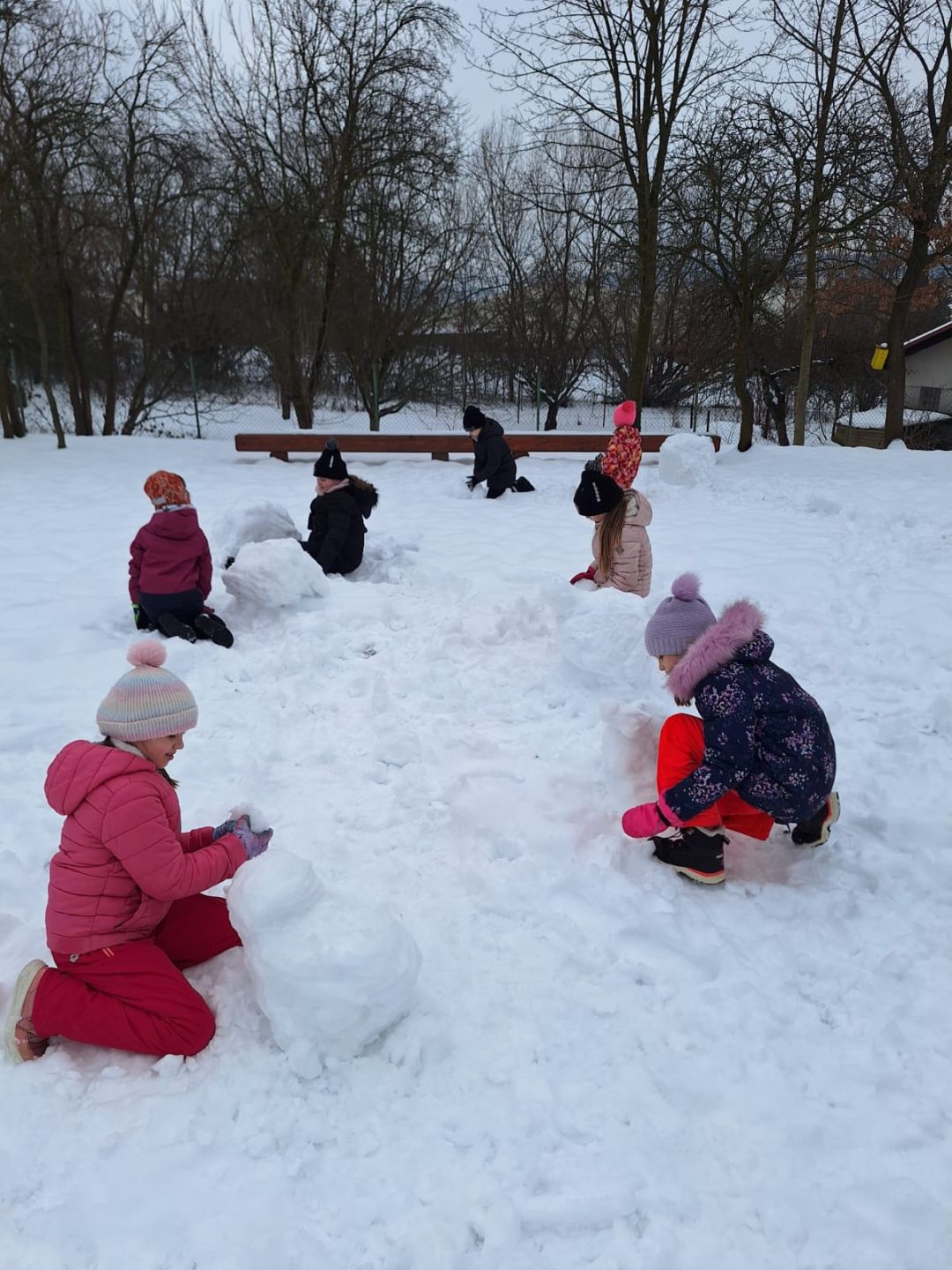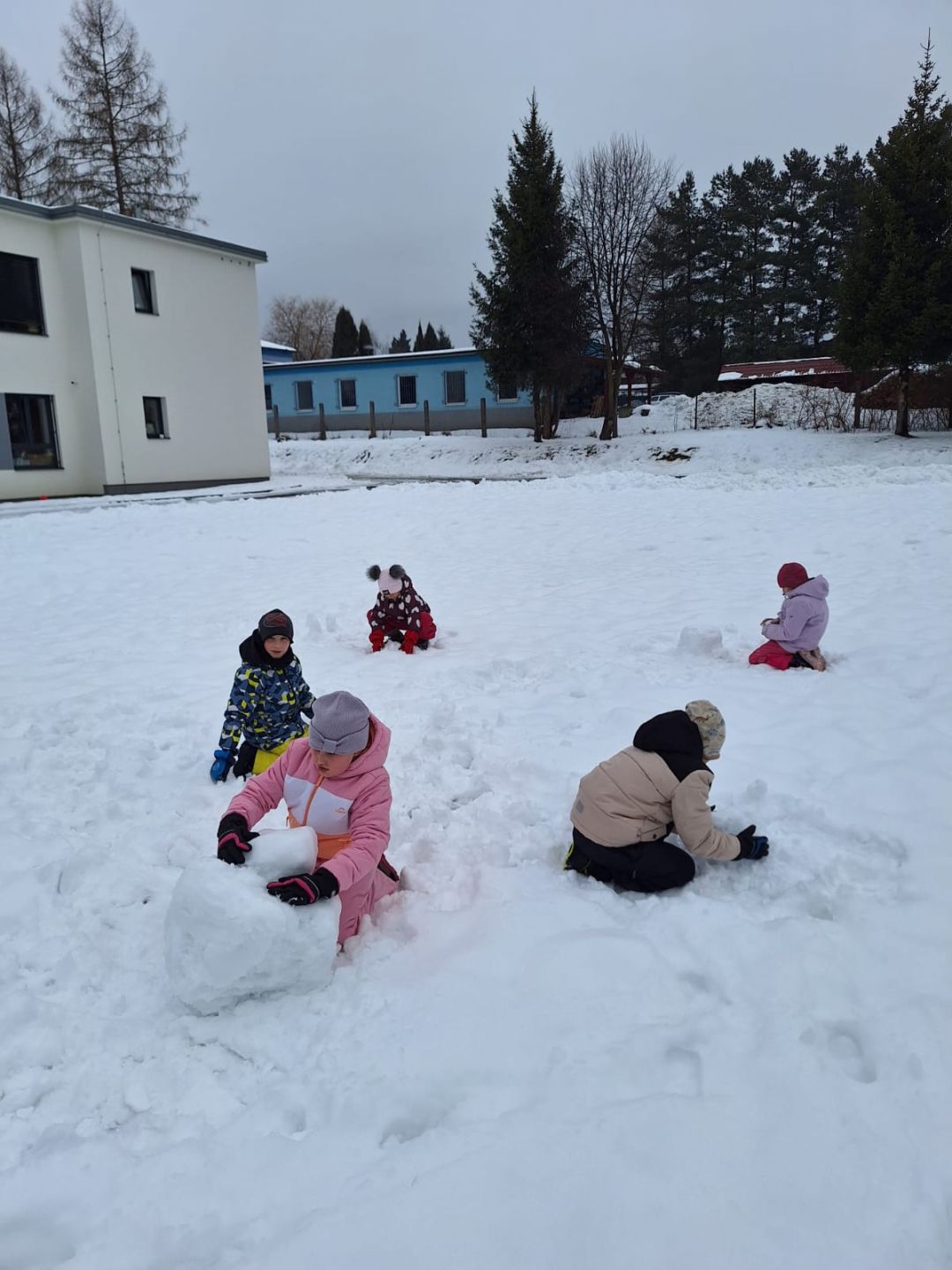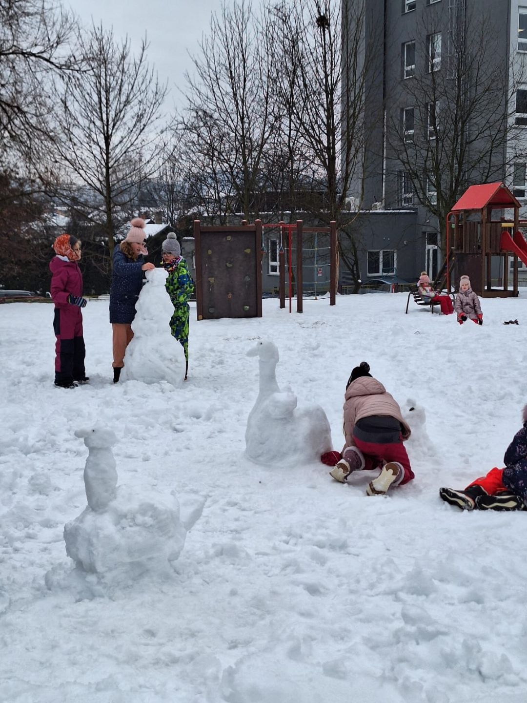 Žáci 2.B a třetího ročníku si zahráli v pracovních činnostech na sochaře a vytvořili na školní zahradě pár velmi unikátních kousků. Někteří vytvořili klasické sněhuláky, jiní různá zvířata od želvy, lva kabyparu, medvěda nebo až po labuť.