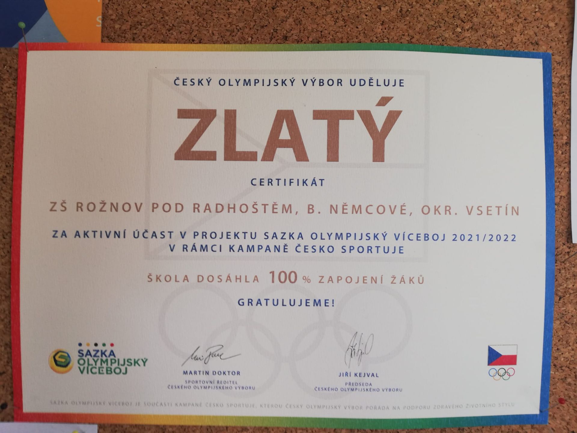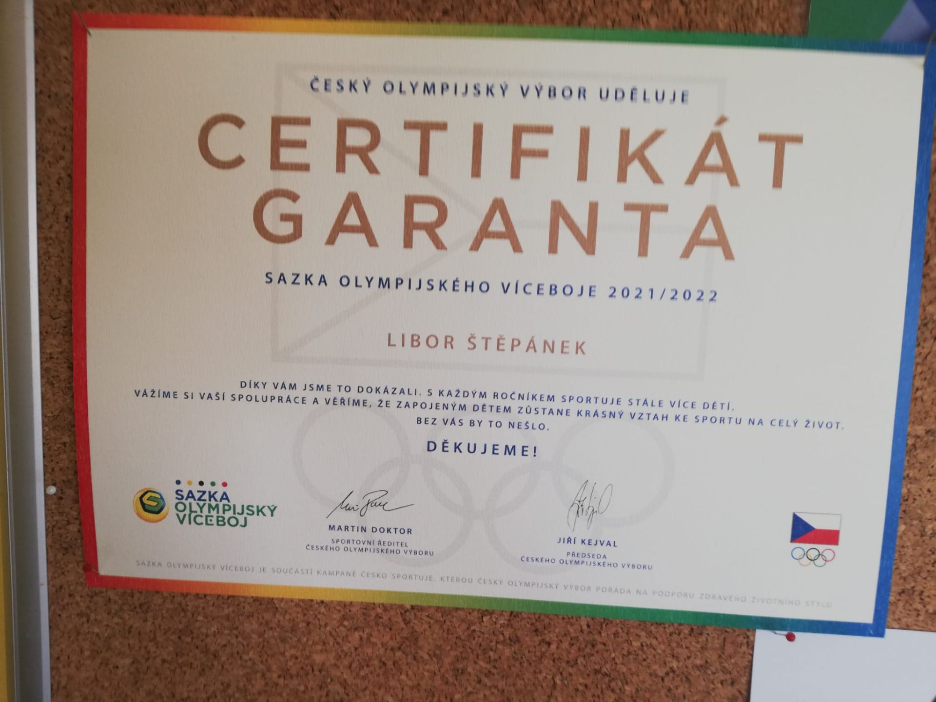 V loňském školním roce jsme získali zlatý certifikát za 100% zapojení žáků do Sazka Olympijského víceboje. Letošní ocenění včetně individuálních diplomů pro žáky získáme na konci školního roku.