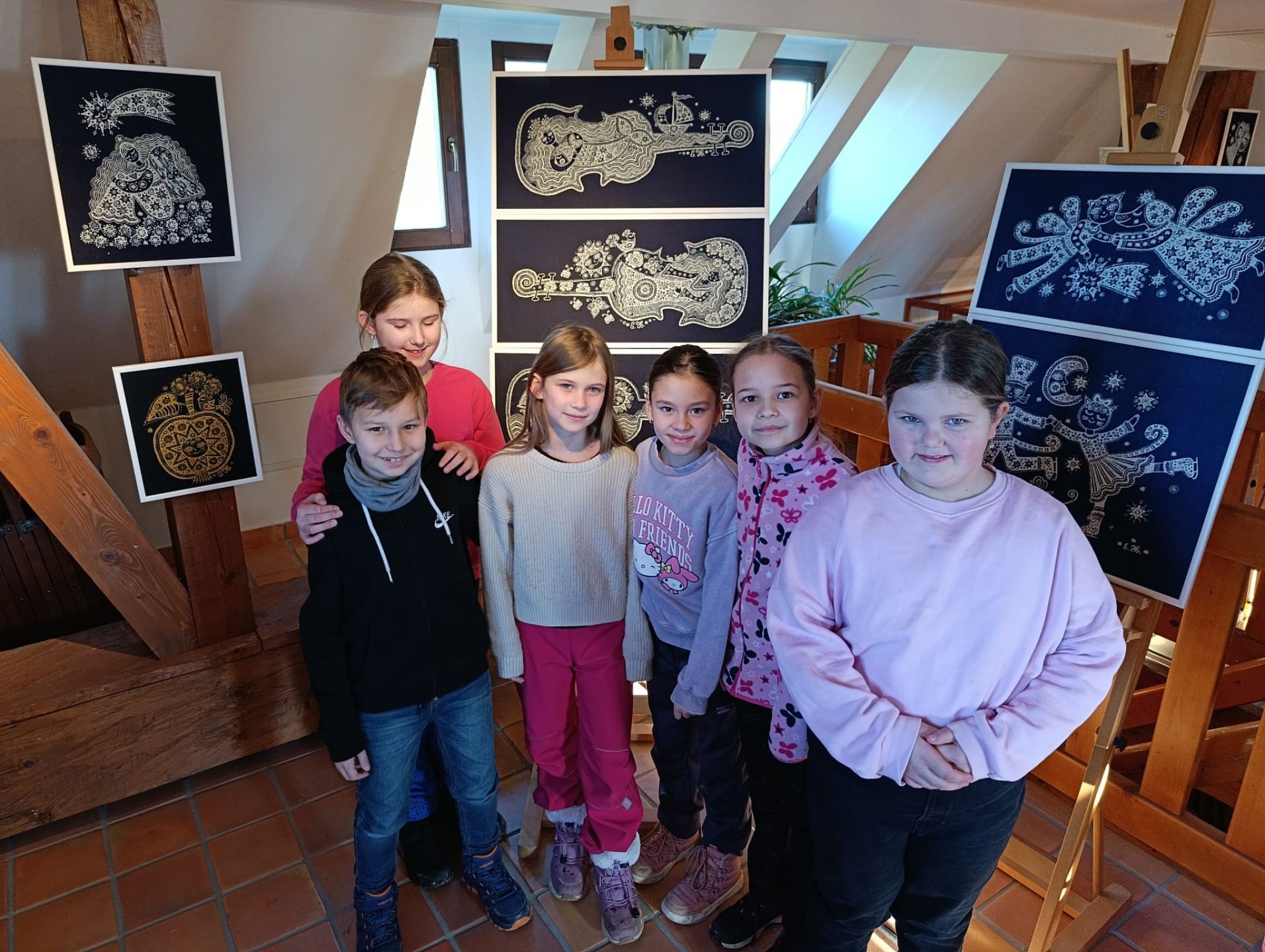 V pátek 12.12. navštívili žáci 3. třídy Zvonici Soláň, kde mohli spatřit vánoční výstavu modrotisku paní umělkyně Evy Horákové. Kromě nádherných obrazů často se zvířatkovými motivy si děti také zazpívaly vánoční koledy za klavírního a flétnového doprovodu dětí a paní učitelky. Byl to příjemný společně strávený čas po valašsku.