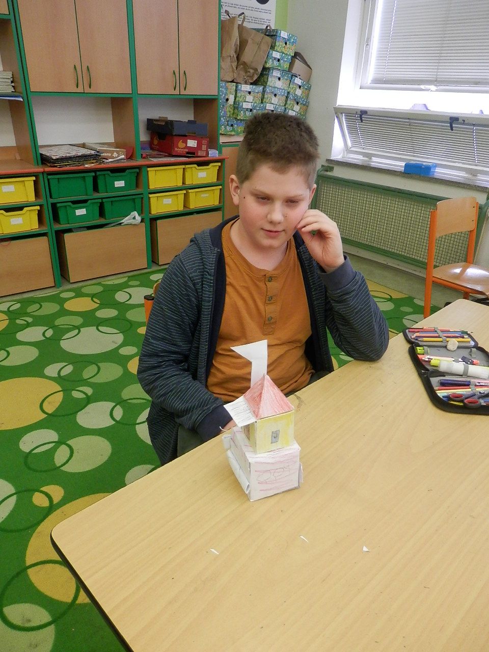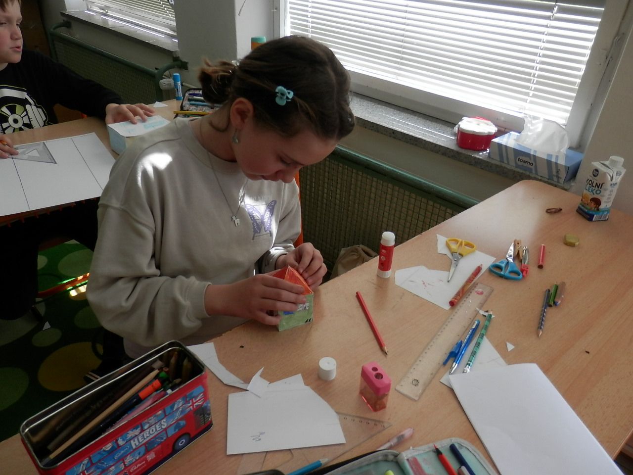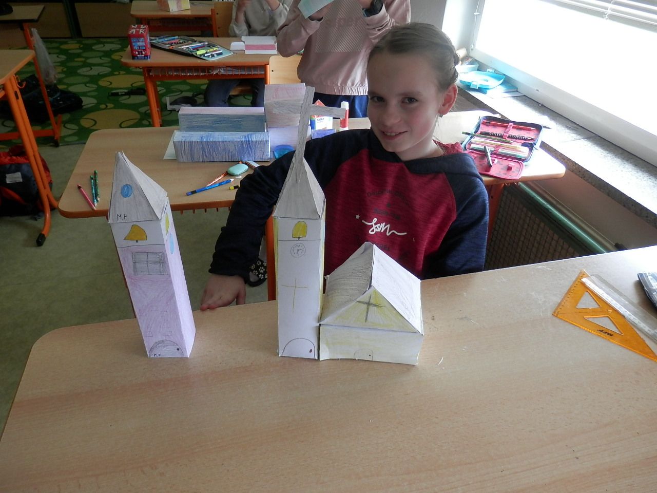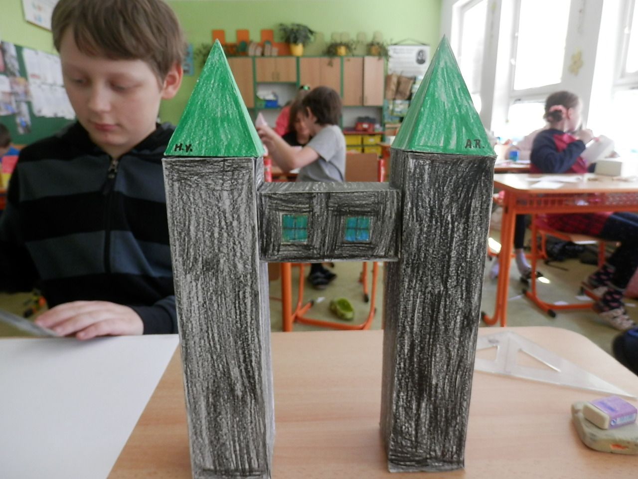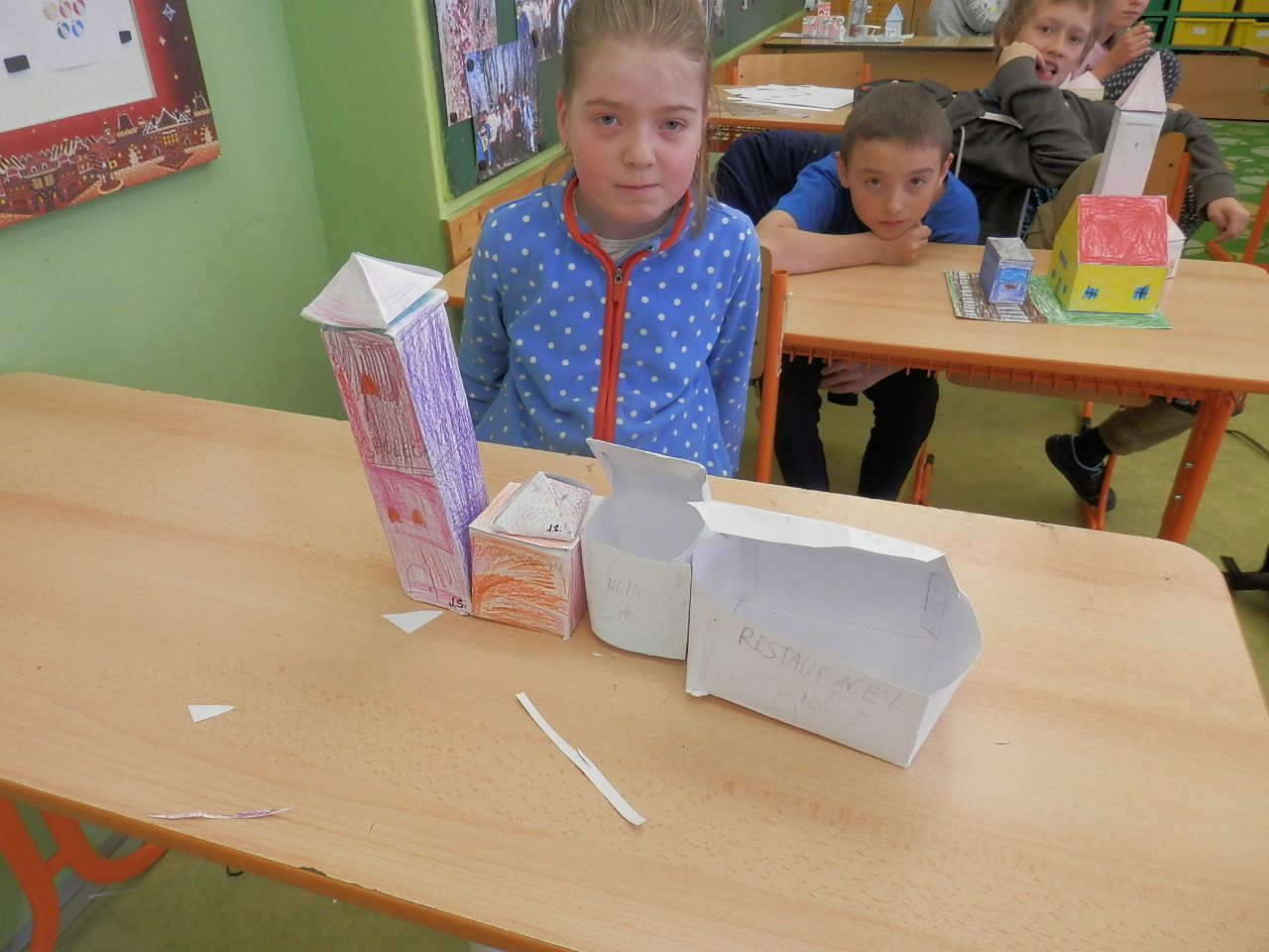 Žáci čtvrté třídy strávili čtvrteční dopoledne výrobou papírových modelů. K výrobě využívali znalost geometrických těles, které si narýsovali na tvrdý papír, vystřihli, vymalovali a slepili (krychle, kvádr, hranol, jehlan). Jak se práce žákům podařila můžete posoudit z fotografií a modelů, které žáci vyrobili.