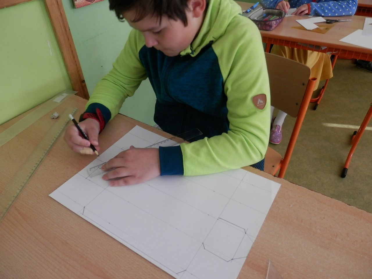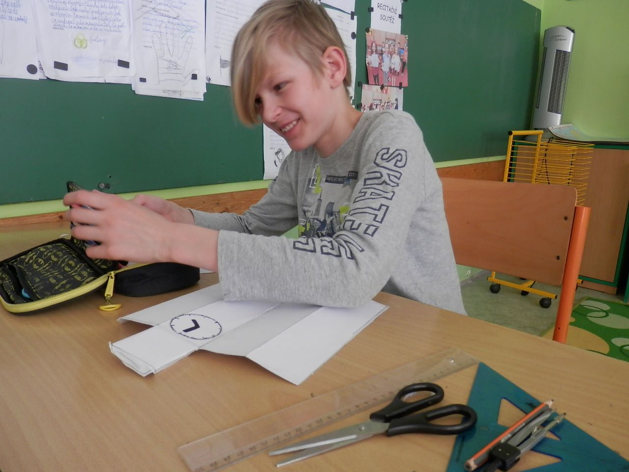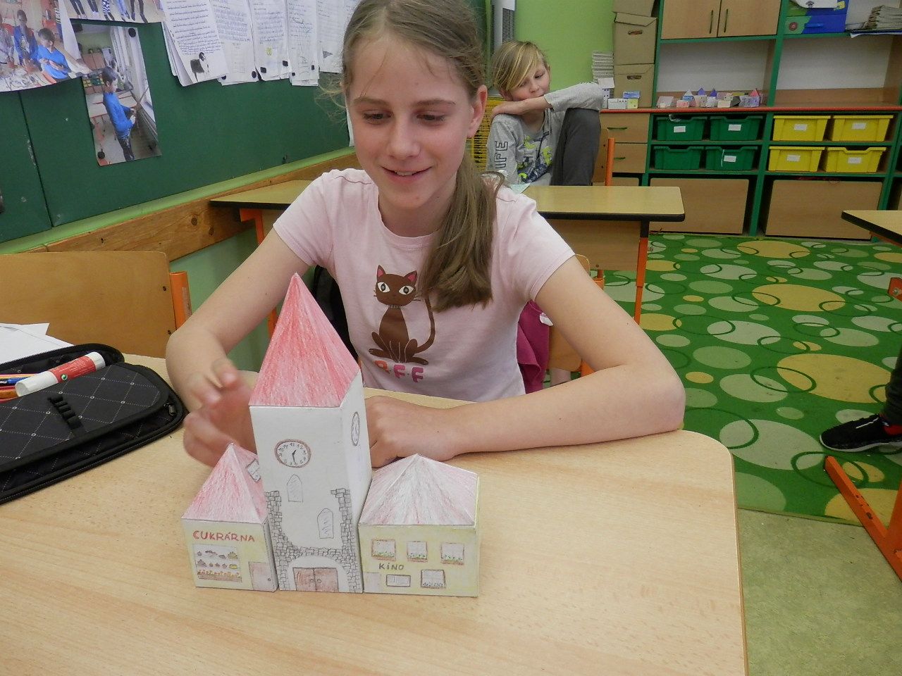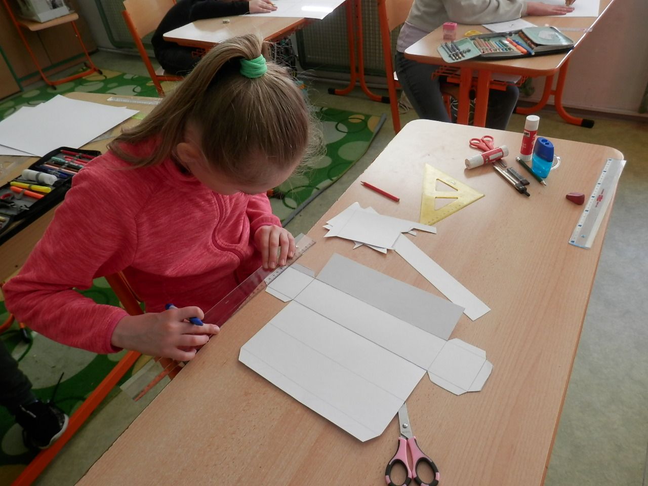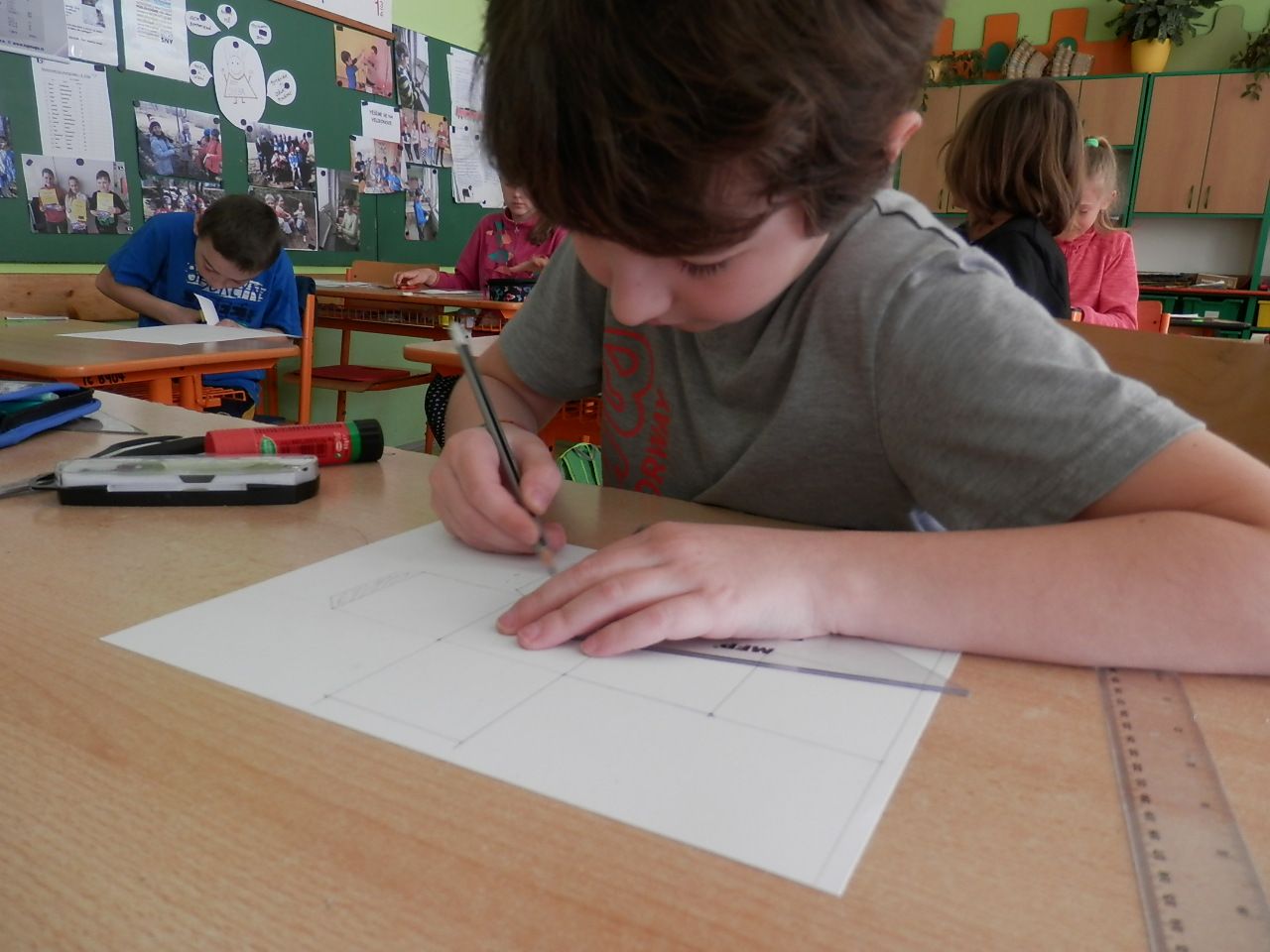 Žáci čtvrté třídy strávili čtvrteční dopoledne výrobou papírových modelů. K výrobě využívali znalost geometrických těles, které si narýsovali na tvrdý papír, vystřihli, vymalovali a slepili (krychle, kvádr, hranol, jehlan). Jak se práce žákům podařila můžete posoudit z fotografií a modelů, které žáci vyrobili.