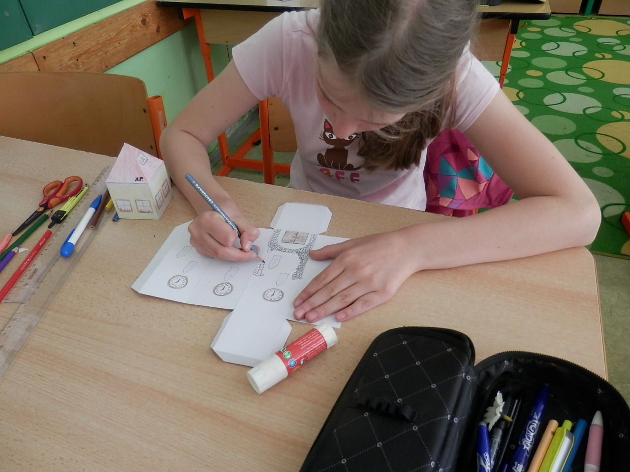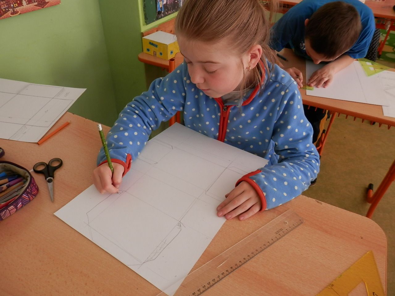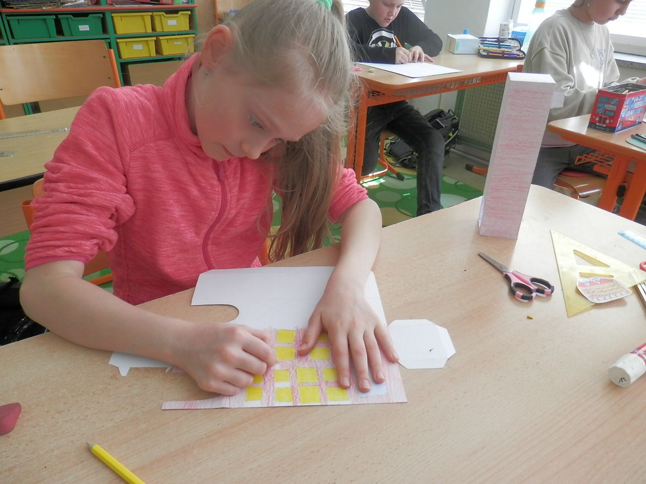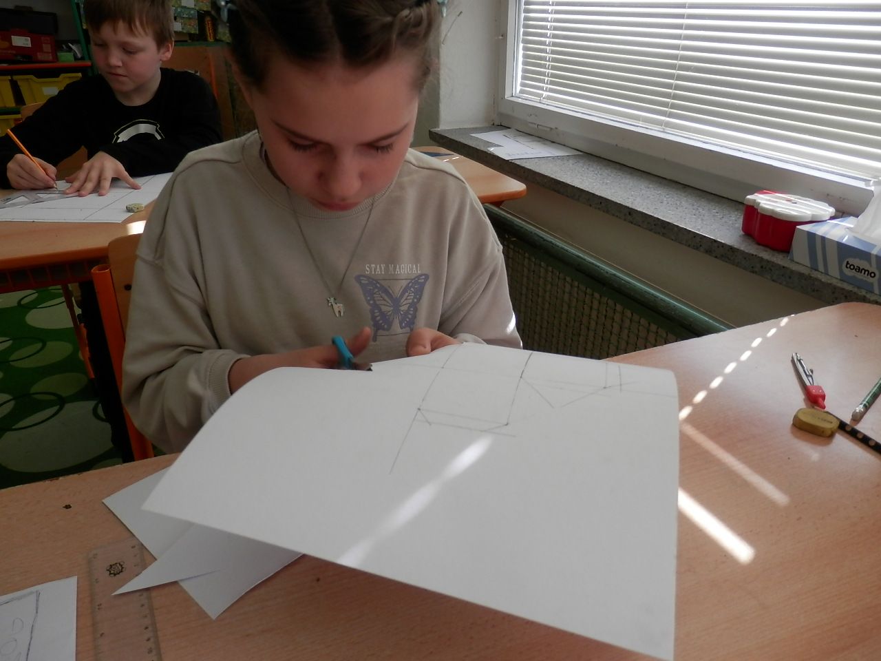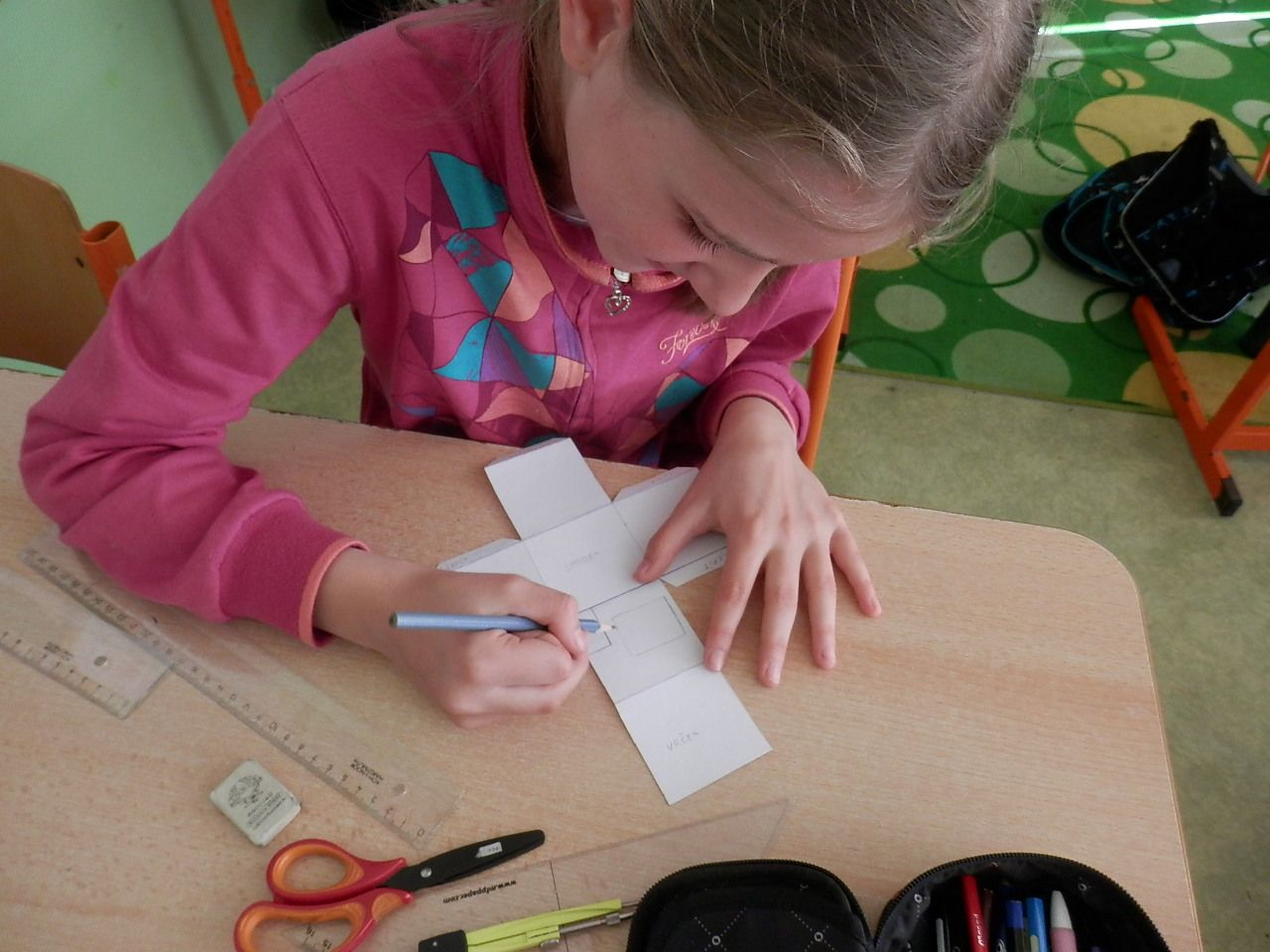 Žáci čtvrté třídy strávili čtvrteční dopoledne výrobou papírových modelů. K výrobě využívali znalost geometrických těles, které si narýsovali na tvrdý papír, vystřihli, vymalovali a slepili (krychle, kvádr, hranol, jehlan). Jak se práce žákům podařila můžete posoudit z fotografií a modelů, které žáci vyrobili.