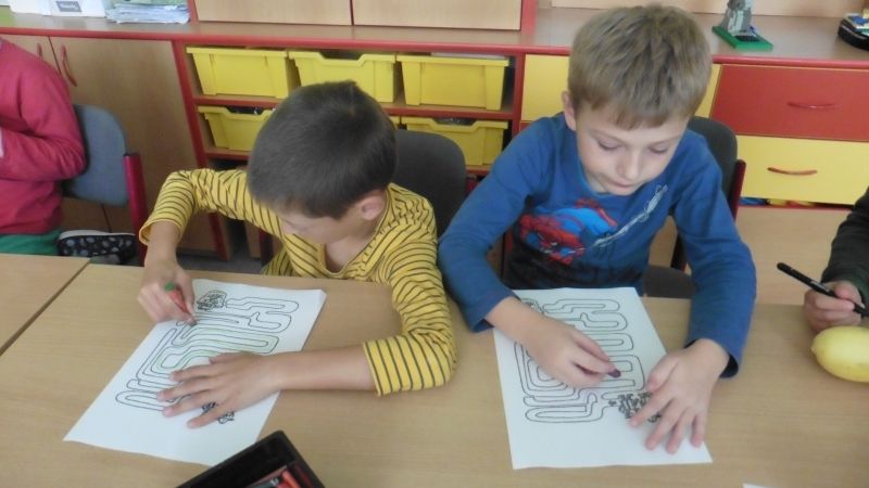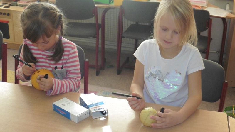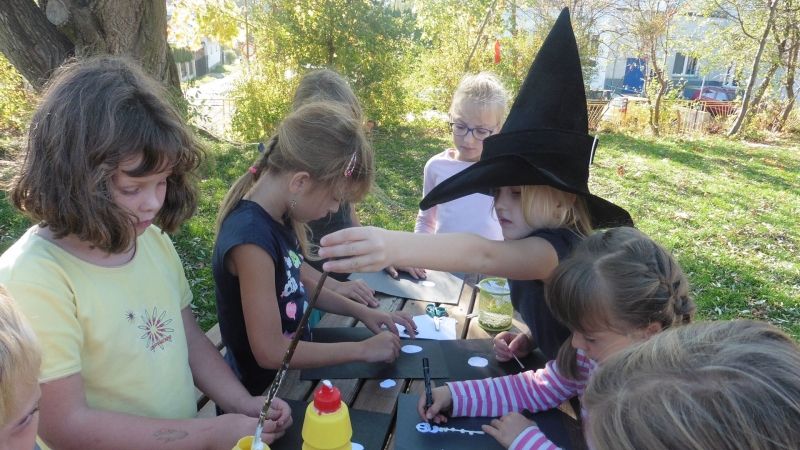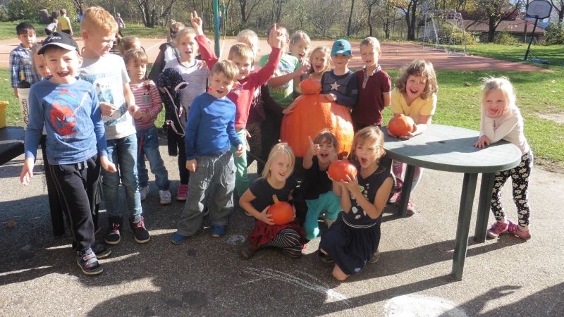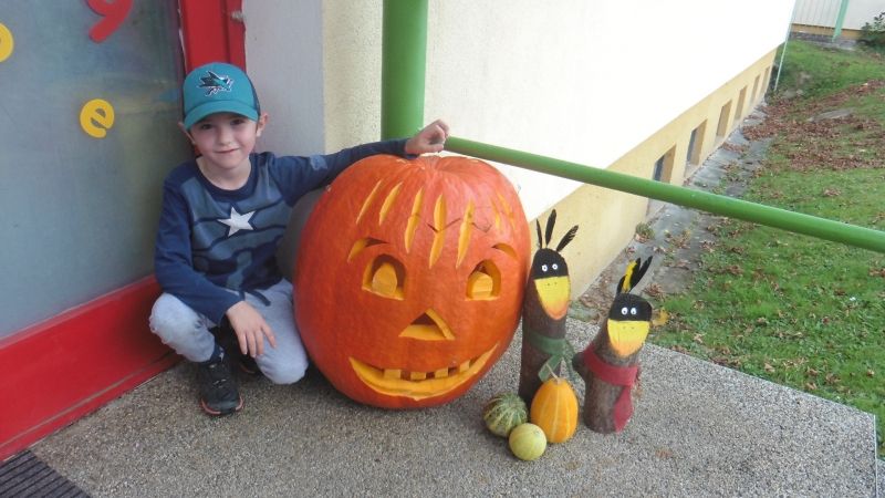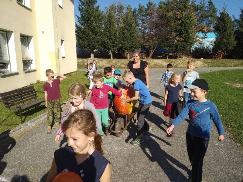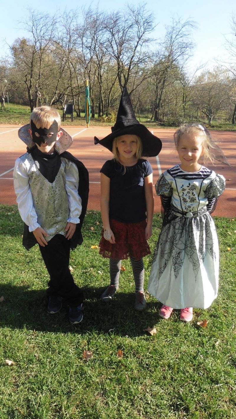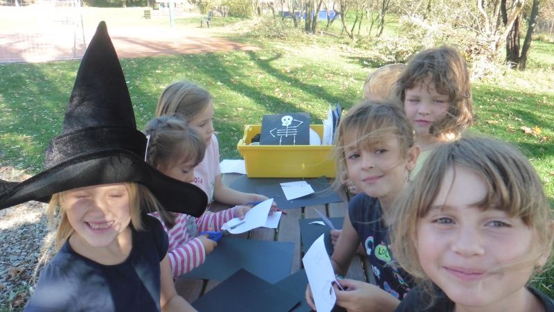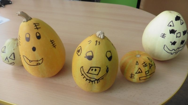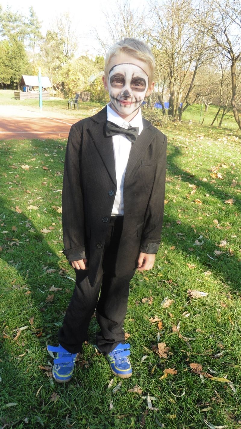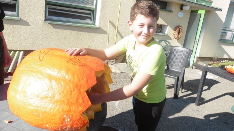 Ve čtvrtek 24. října jsme v 1. oddělení ŠD oslavili svátek Halloween. Nejprve jsme si popovídali o tradicích a zvycích v tento den, přečetli si strašidelnou pohádku a převlékli jsme se do strašidelných kostýmů. Potom jsme se vydali na zahradu, kde nás čekala spousta aktivit a činností k tomuto tématu. Malovali jsme na okrasné dýně strašidelné obličeje, vyráběli si halloweenské dekorace ( kostlivce ), vymalovávali omalovánky, kde byli samí duchové a pavouci, také dopisovali cestičky ve strašidelných bludištích. Samozřejmě nechybělo malování na obličej a diskotékový rej ve strašidelných kostýmech. Na samotný závěr jsme na kolečkách přivezli extrémně velikou dýni a dlabali jsme a dlabali. Celou dobu nám venku krásně svítilo sluníčko a odpoledne jsme si opět bezvadně užili. Ta velikánská halloweenská dýně zdobí náš hlavní vchod školy.