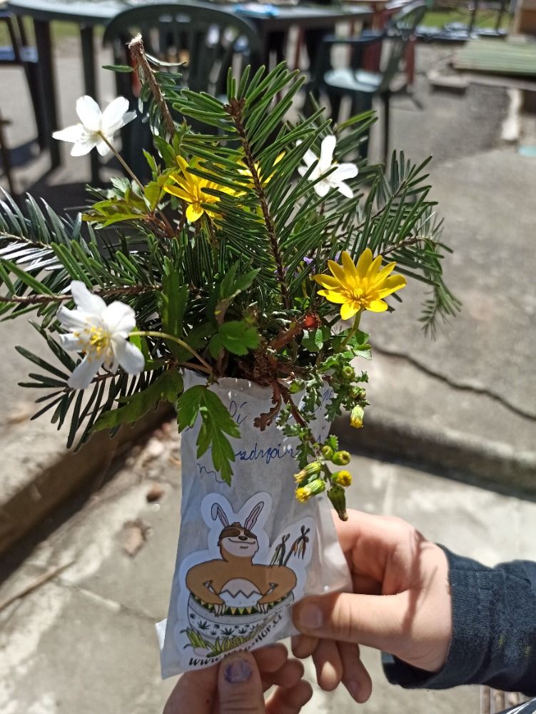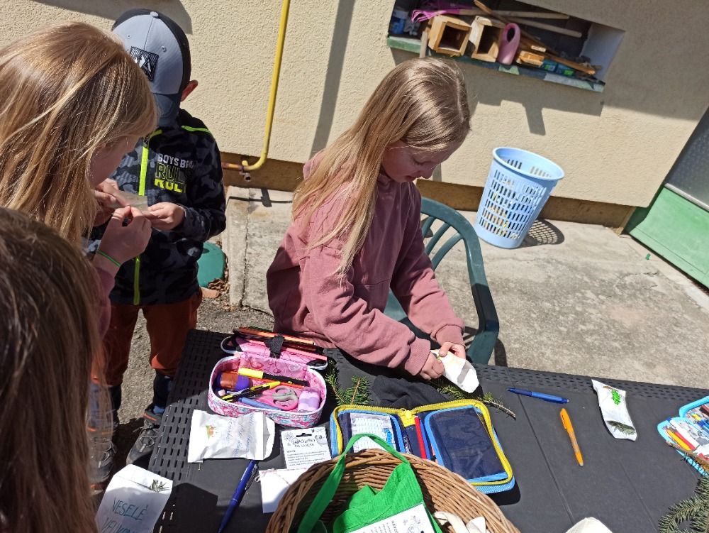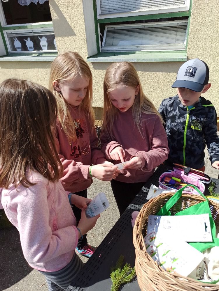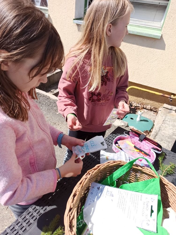 13.4. hledaly děti z druhého oddělení družiny poklad velikonočního zajíčka na zahradě ZŠ Záhumení. Na zašifrovaném dopisu našly obarvené vejce řepou, cibulí a kardamonem, papírový pytlík s nálepkou, na který napsaly přání k Velikonocím a vyzdobily zelenými větvičkami.