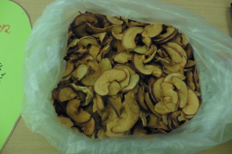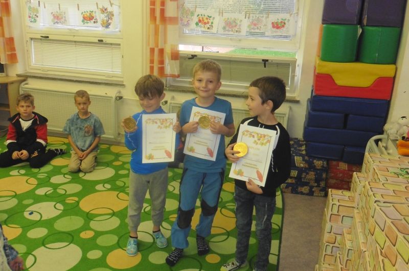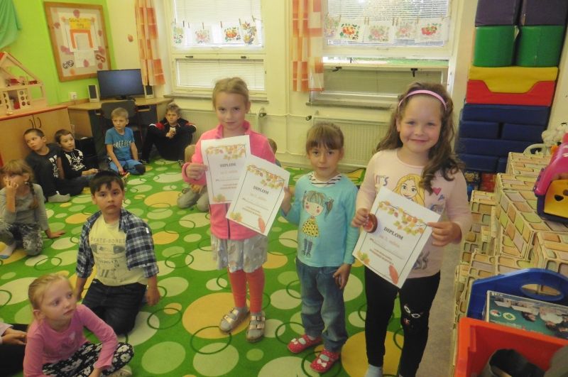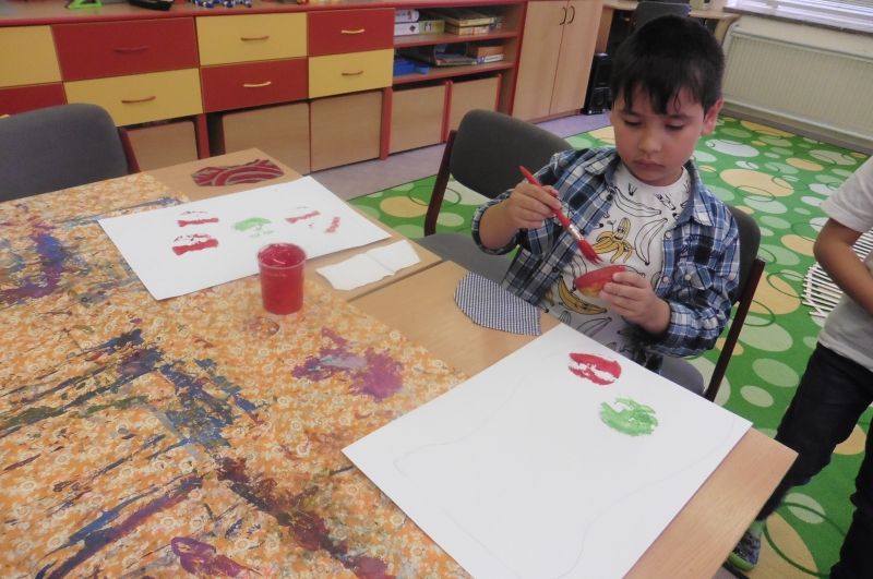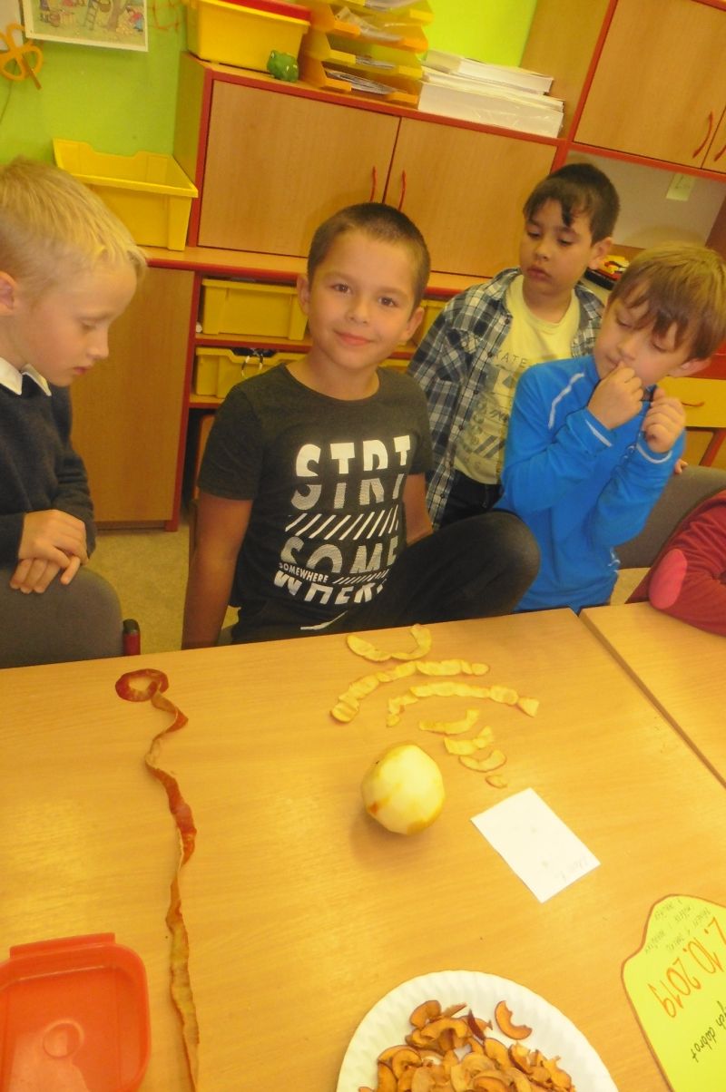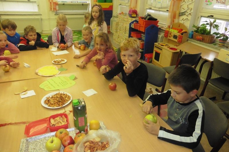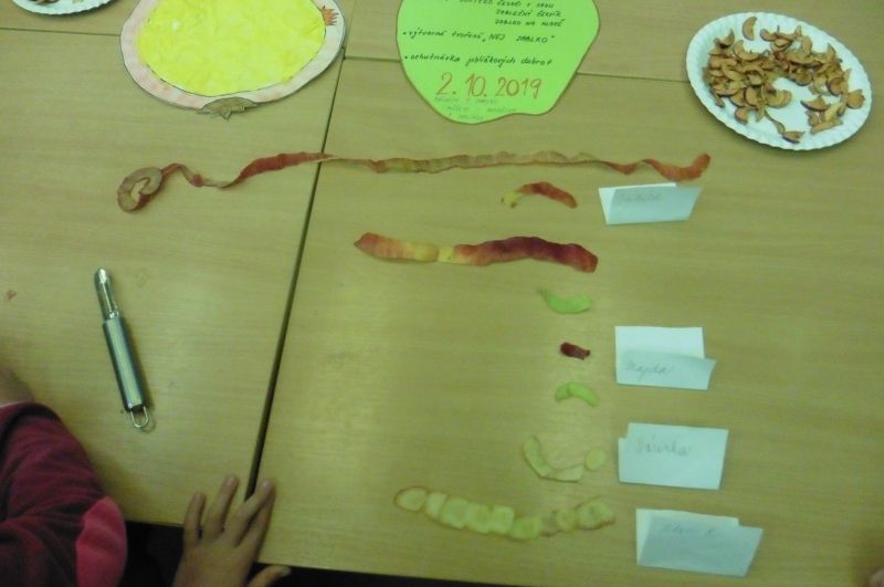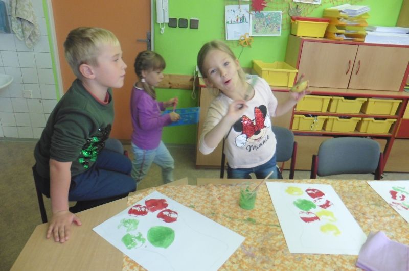 Ve středu 2. října se nesla celou družinou vůně jablíček. V tento den jsme totiž měli Jablíčkový den. Chtěli jsme se něco o tomto slaďoučkém podzimním ovoci dozvědět, něco jablíčkového zbaštit a zasoutěžit či vyrobit. Každý si měl donést jedno jablíčko a dokonce některé děti přinesly i jablíčkové dobroty. Nejprve jsme si v družině všechna jablíčka vystavili. Povídali jsme si o podzimním ovoci a zazpívali si o jablíčkách písničky. Jako první jsme se pustili do ochutnávání dobrot. Měli jsme jablečnou buchtu, rohlíčky s jablíčkovou náplní, jablečnou přesnídávku i džus a sušené „křížaly“. Takto posilněni jsme se pustili do soutěžení. Nejprve jsme zkusili vyrobit co nejdelšího jablečného červíka. Pomocí škrabky jsme se snažili oloupat co nejdelší jablečnou slupku. Byla to pro některé děti těžká disciplína, jelikož držely škrabku poprvé v životě v ruce. V tělocvičně byly připraveny další úkoly. Zahráli jsme si na česače v sadu a také se trefovali míčkem do jablečného červa. Na závěr dne jsme si vyrobili krásnou jablíčkovou dekoraci a jablečným razítkováním jsme „uvařili kompot“. Všechna jablíčka jsme potom rozkrájeli a moc jsme si na nich pochutnali. Celý jablíčkový den jsme si bezvadně užili a těšíme se na další družinovou podzimní akci.