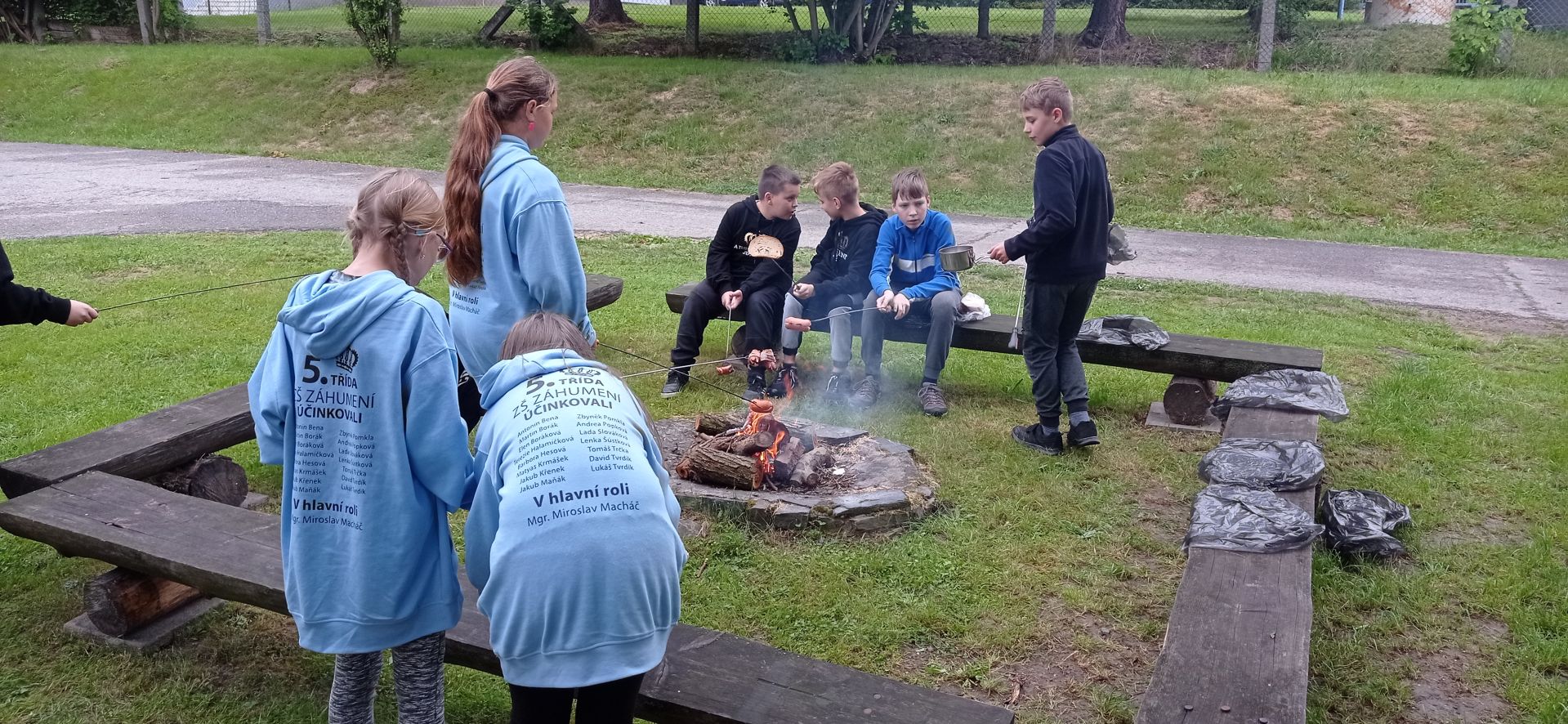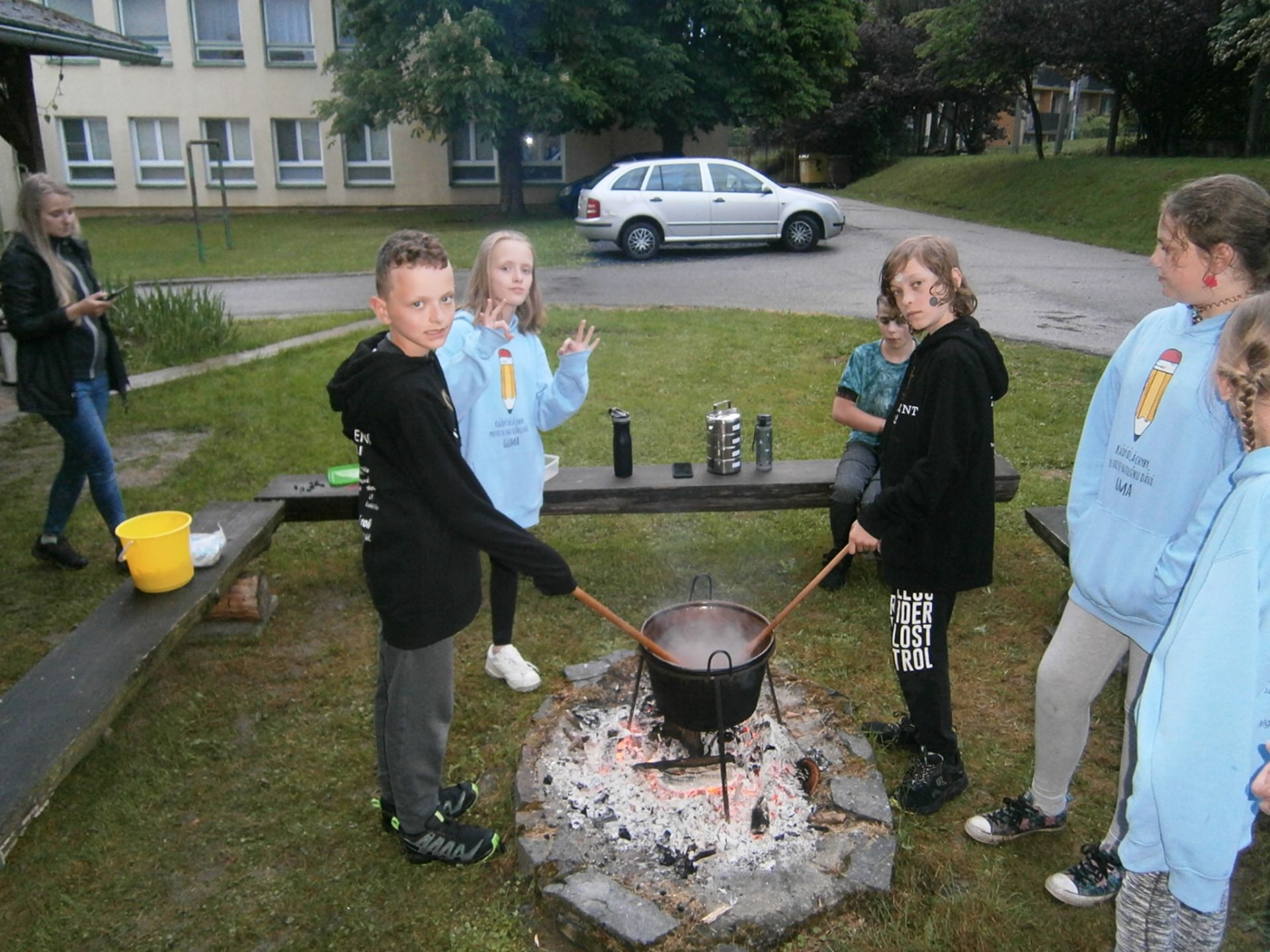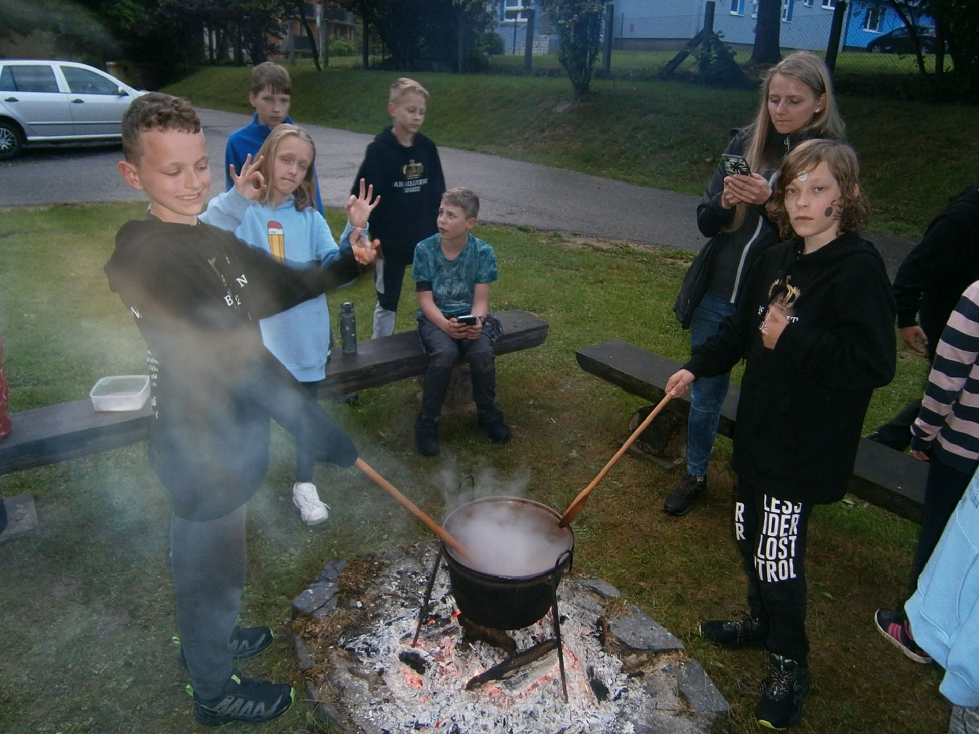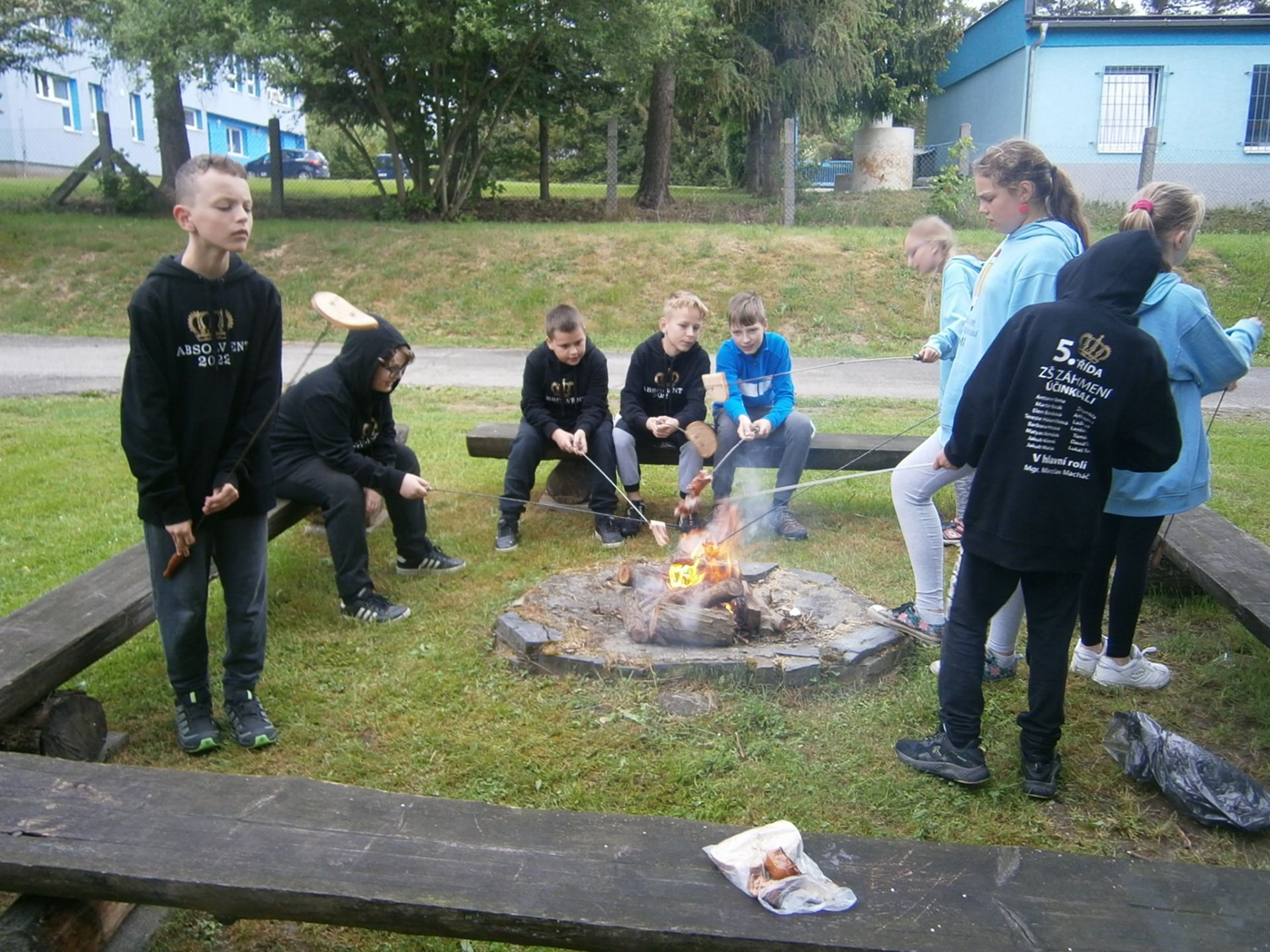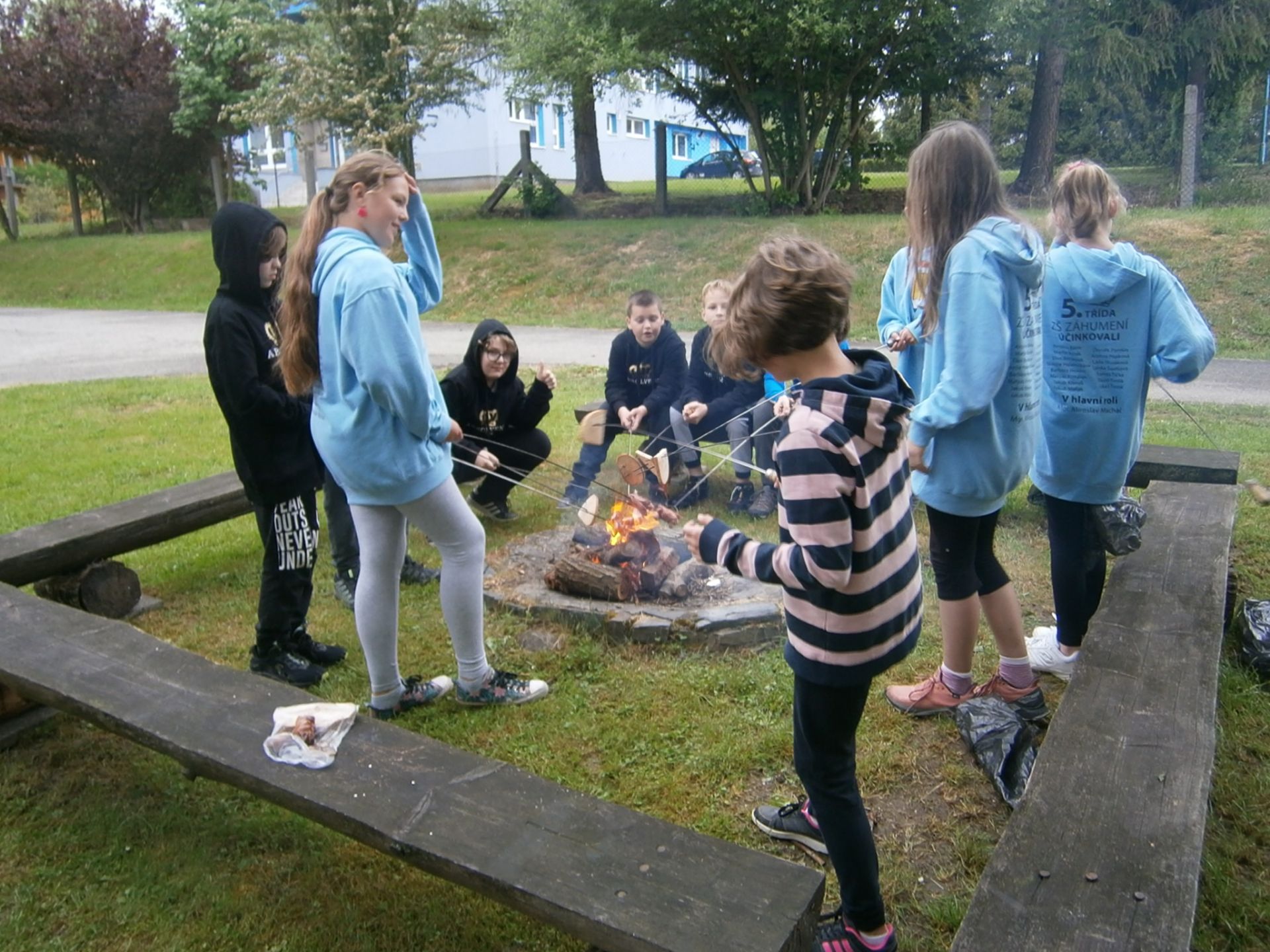 Po společném uvítání se děti ubytovaly v přízemních učebnách školy. Pak nachystaly ohniště, kde se opékaly špekáčky.