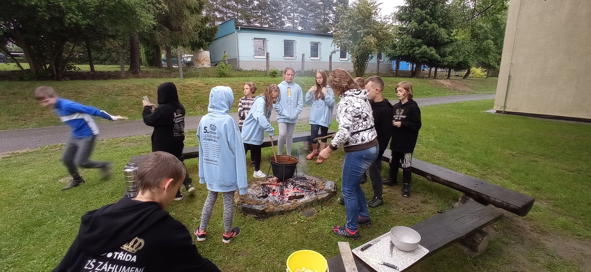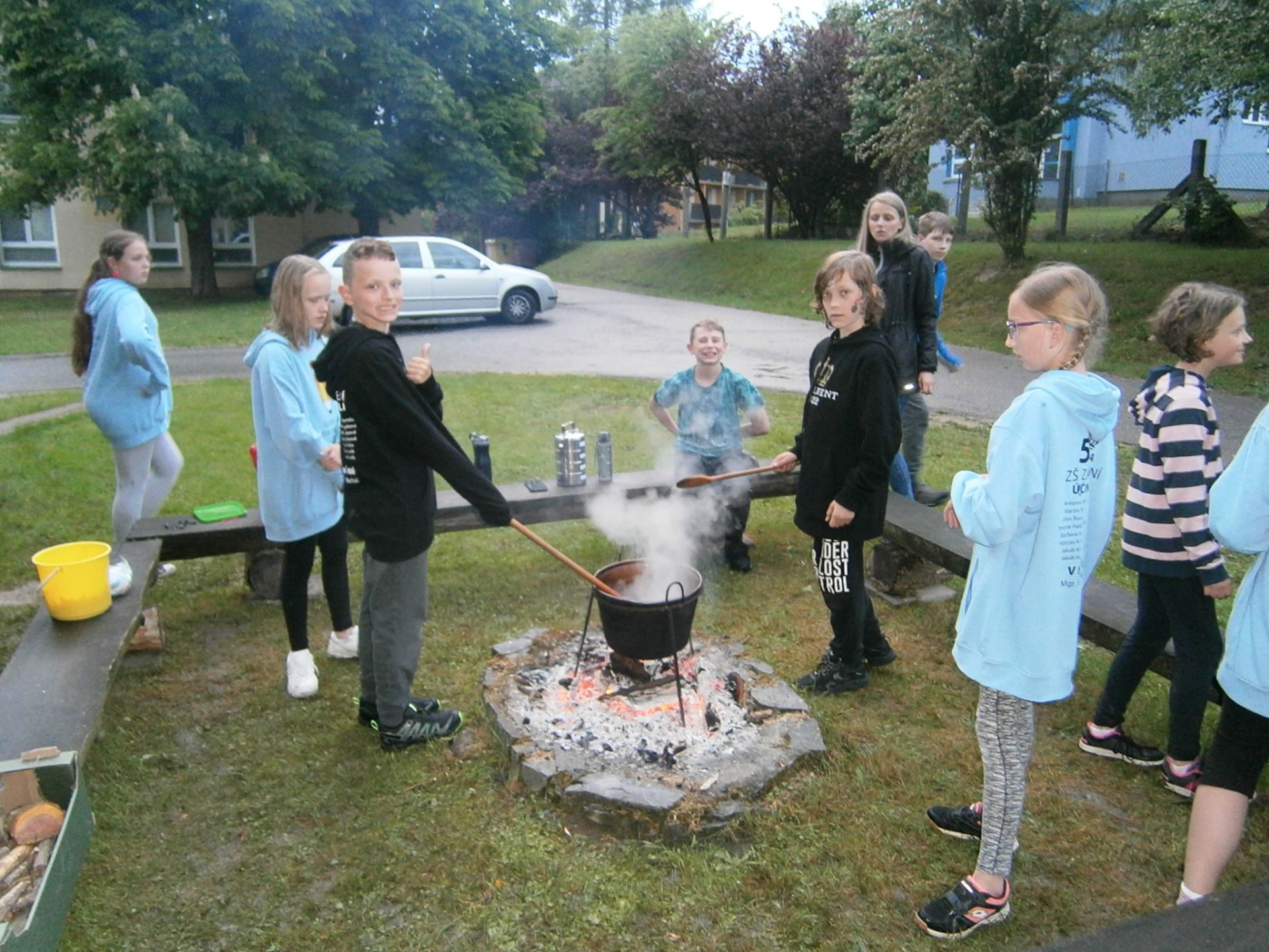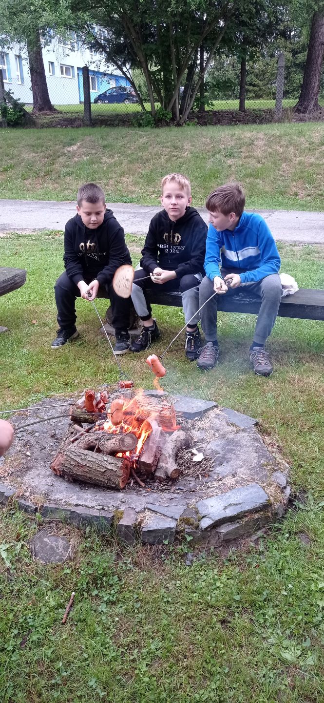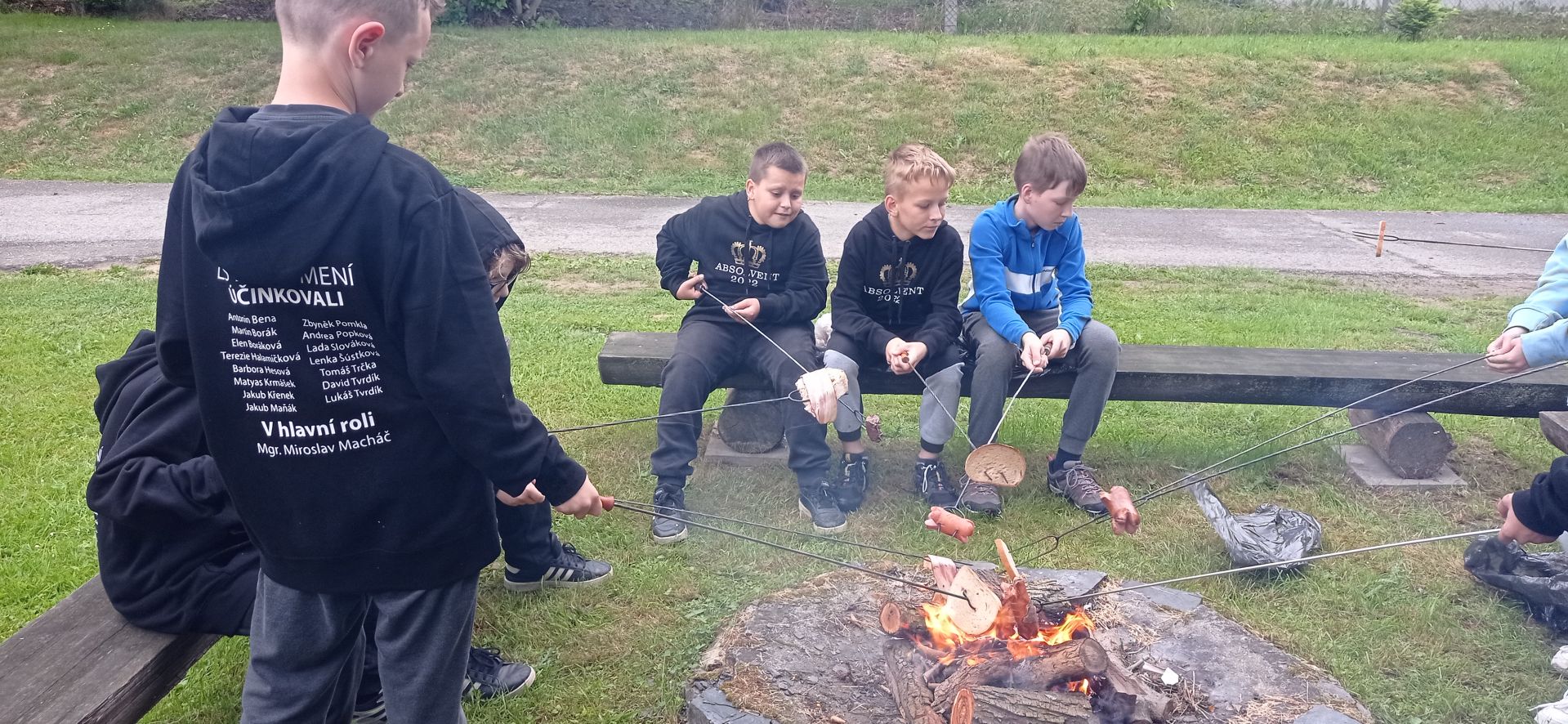 Po společném uvítání se děti ubytovaly v přízemních učebnách školy. Pak nachystaly ohniště, kde se opékaly špekáčky.