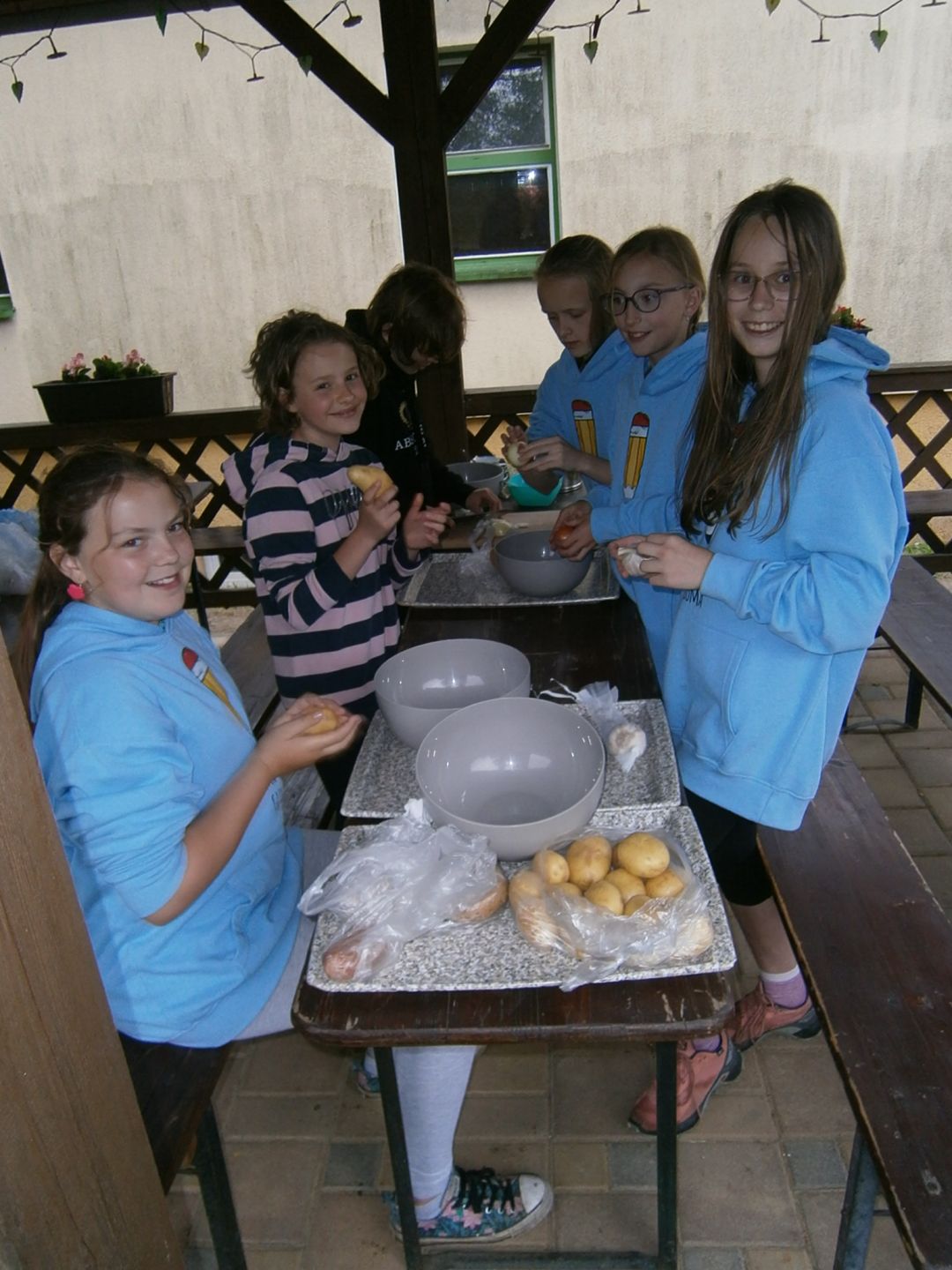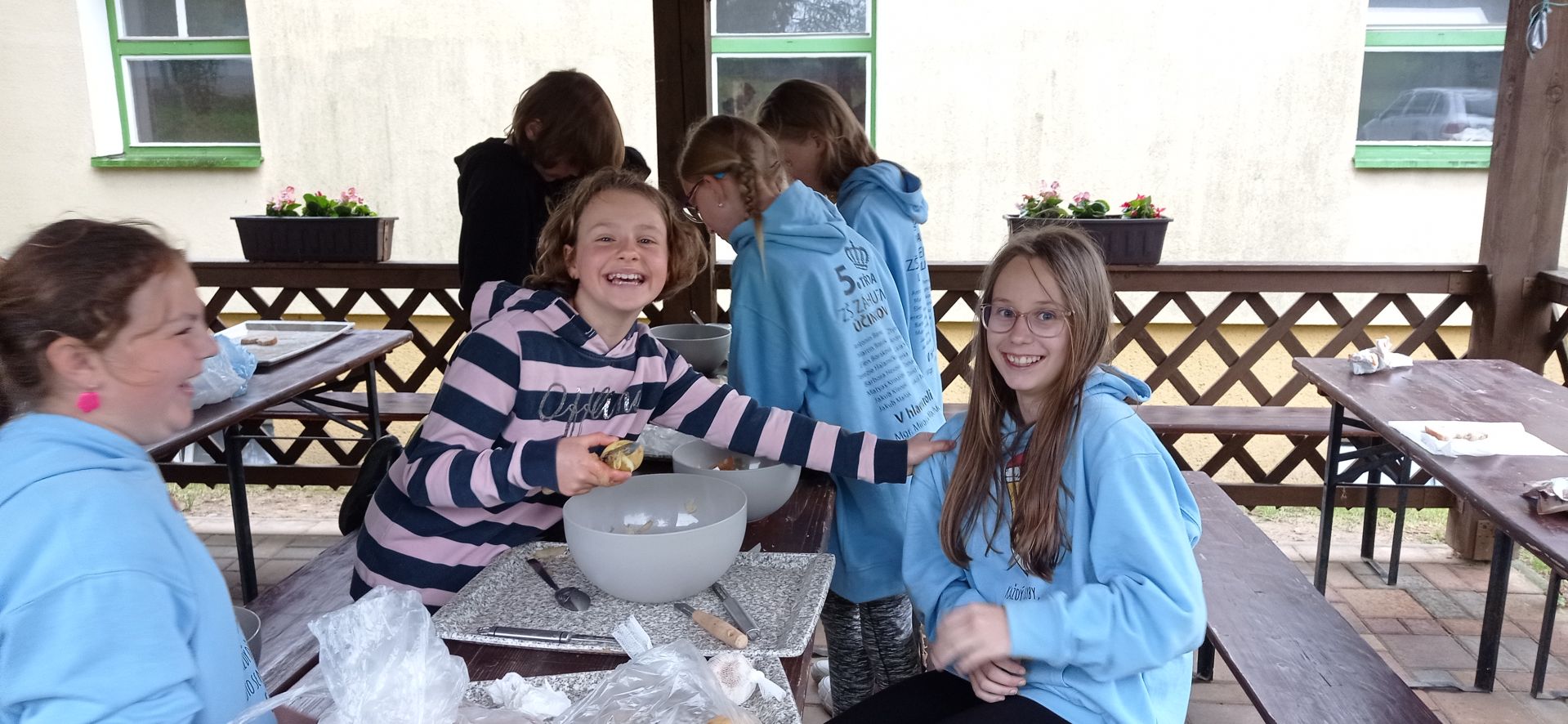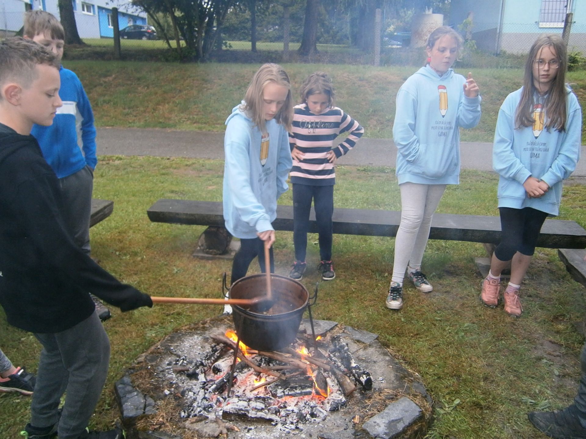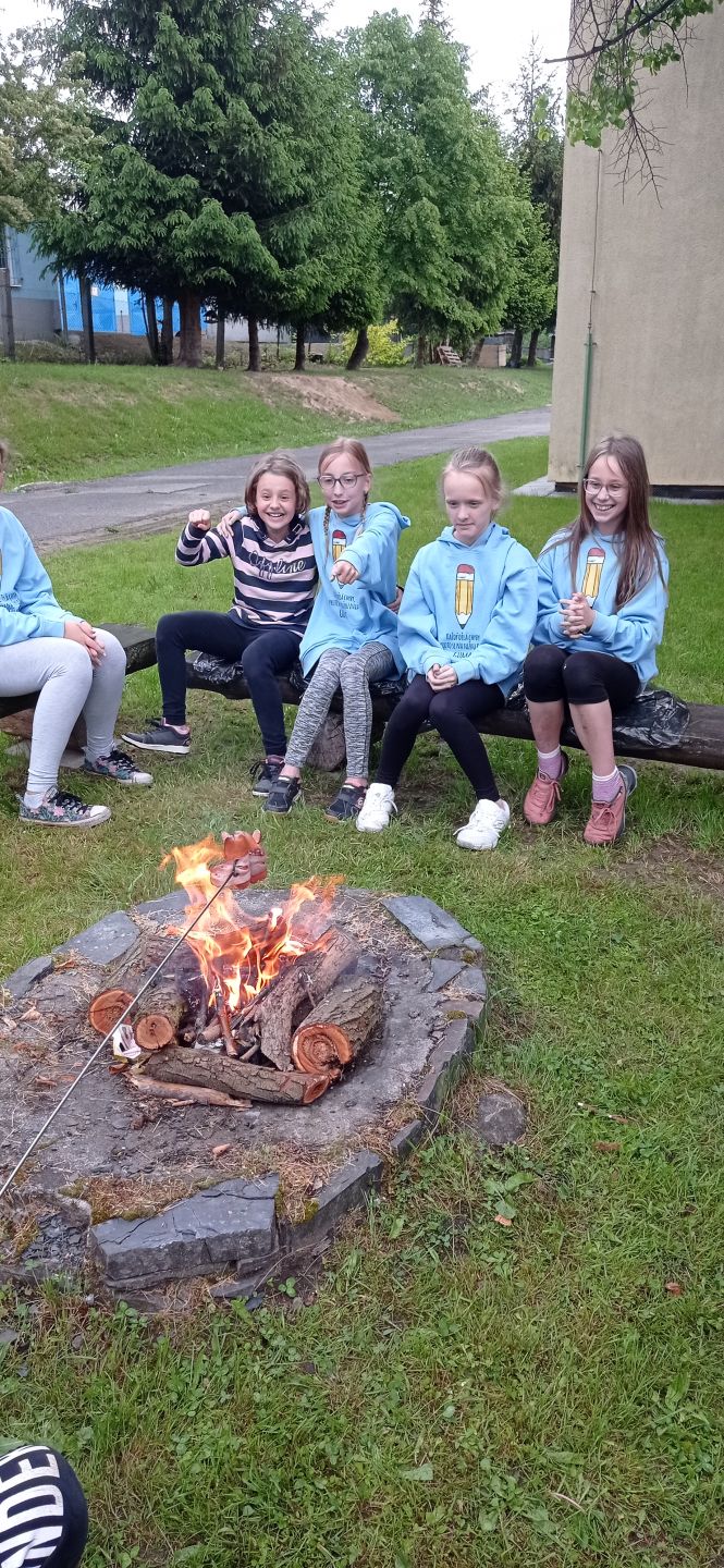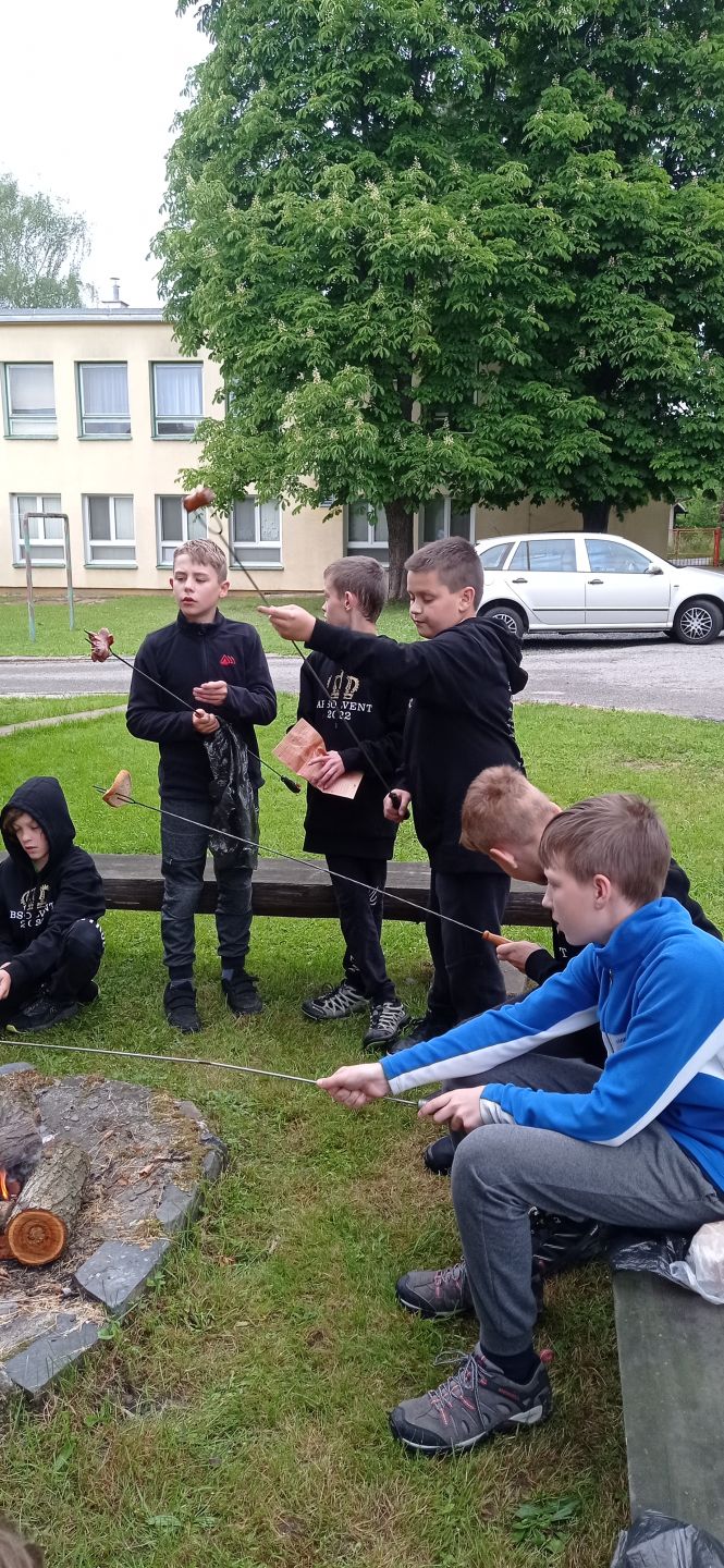 Po společném uvítání se děti ubytovaly v přízemních učebnách školy. Pak nachystaly ohniště, kde se opékaly špekáčky.