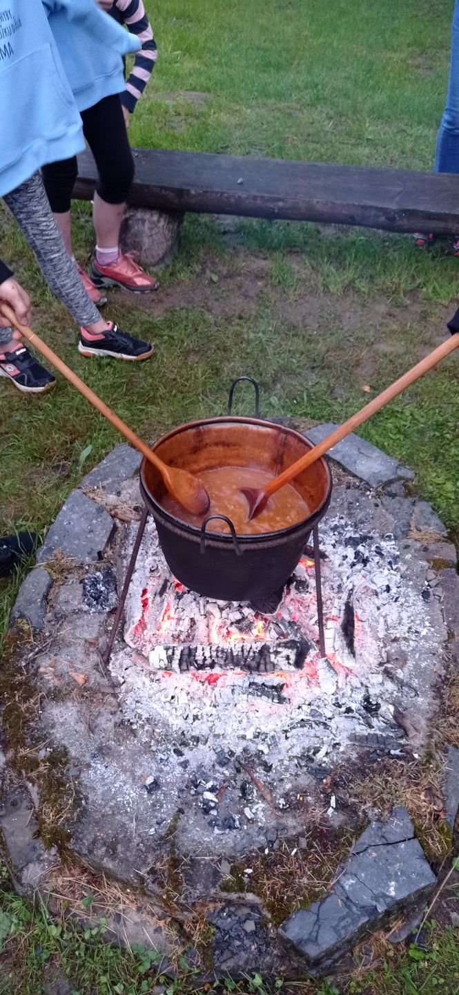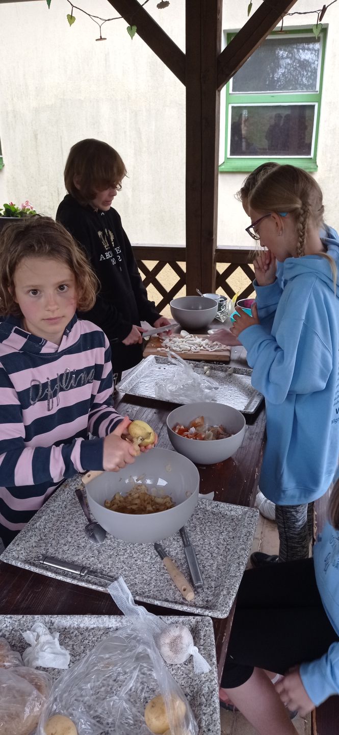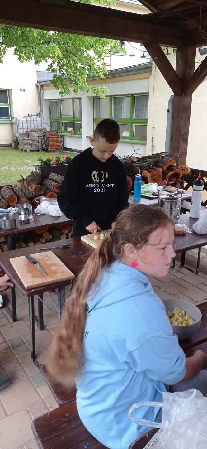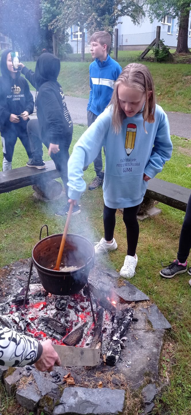 Následovala příprava gulášové kotlíkové polévky v zahradním altánu. Mezitím, co se vařila polévka, děti posbíraly borovicové šišky a větve, aby zahrada byla lépe udržovatelná.