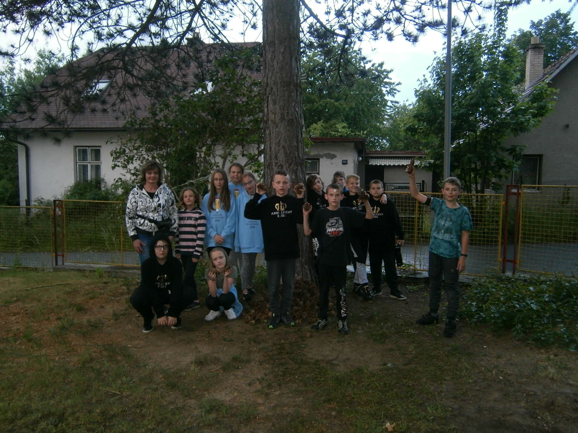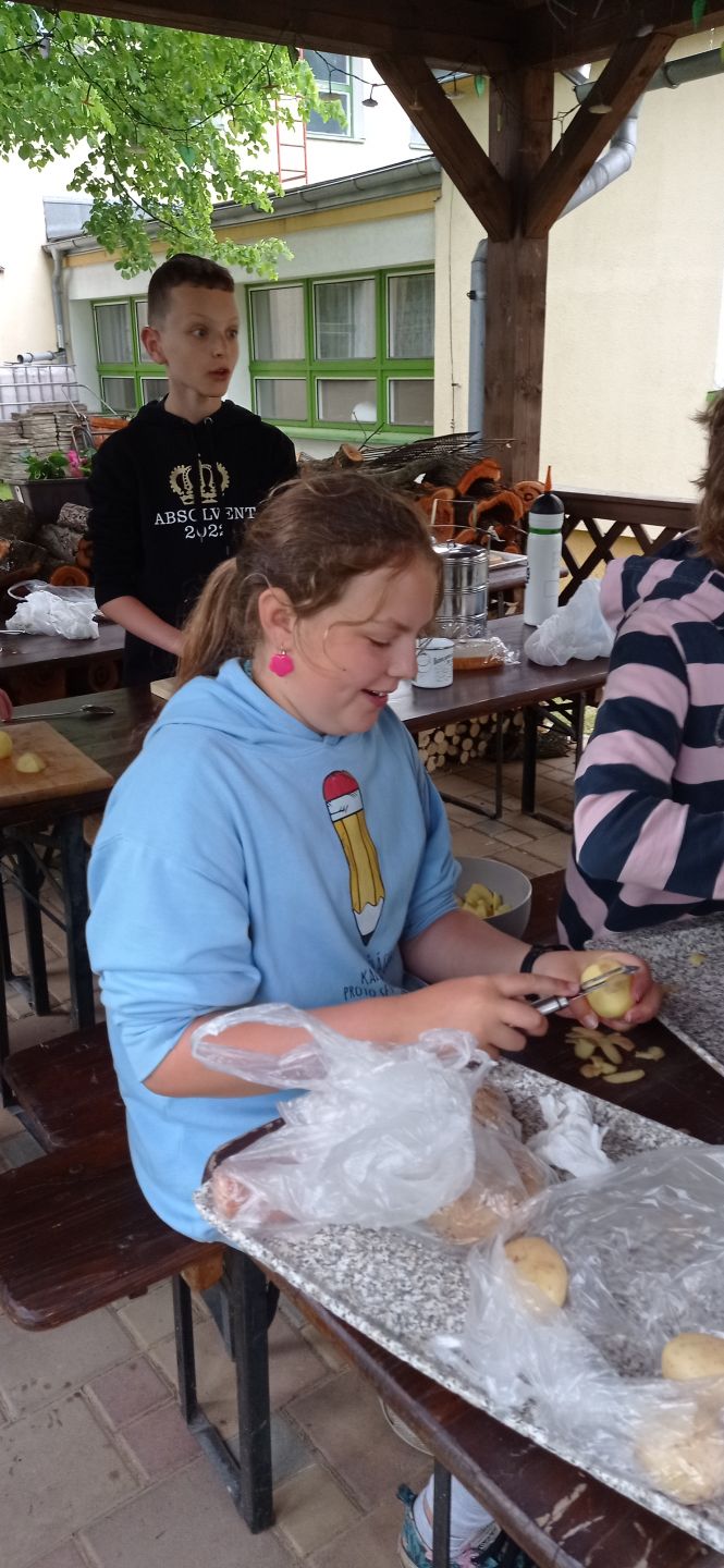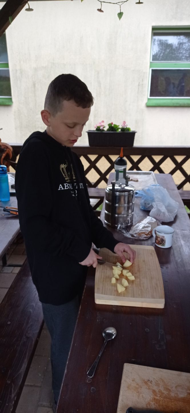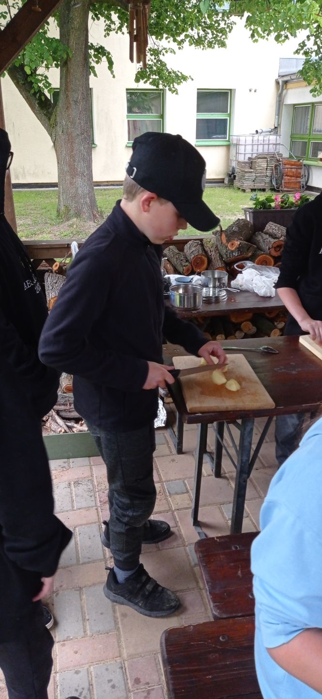 Následovala příprava gulášové kotlíkové polévky v zahradním altánu. Mezitím, co se vařila polévka, děti posbíraly borovicové šišky a větve, aby zahrada byla lépe udržovatelná.