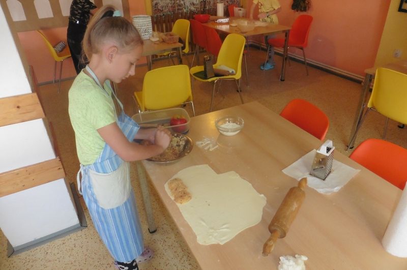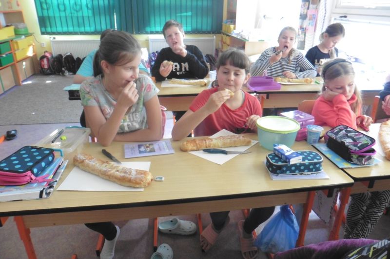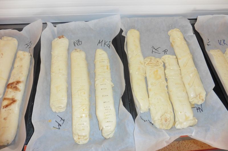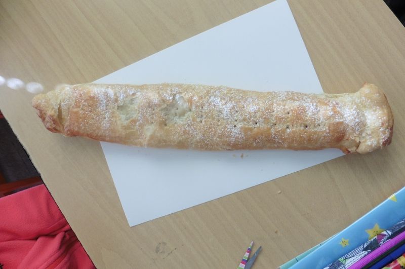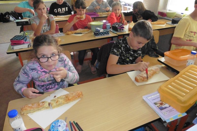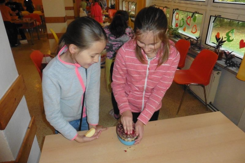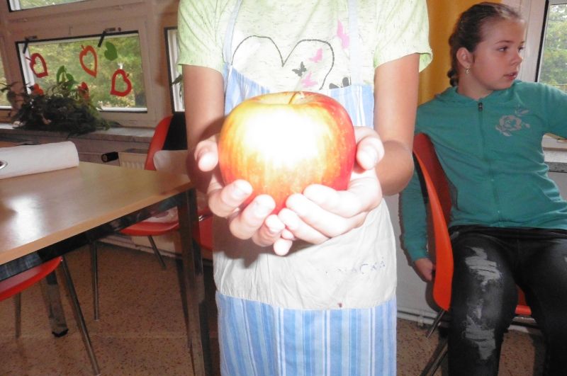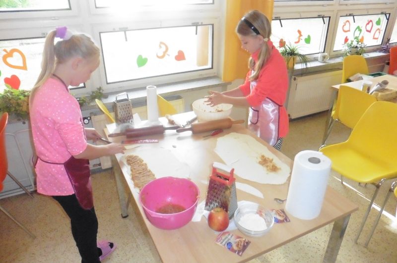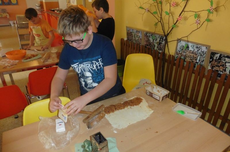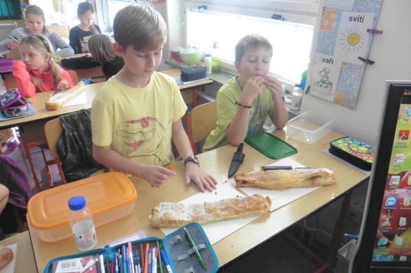 Čtvrťáci už dávno ví, že sem tam se mezi dny s pracovními sešity, učebnicemi a diktáty vloudí jeden usměvavý čtverák..v tomto případě přímo čtvrtek, kdy se učebnice odložily stranou a hodiny vyplnily úplně jinou činností, než je násobilka. A protože v mnoha zahradách se stromy pod tíhou jablíček prohýbají, vymyslela paní učitelka Štrúdlování. Žádná složitá hádanka to není, skutečně jsme se opásali zástěrami, neohroženě uchopili struhadla a válečky na těsto a pustili se do práce. Někteří se přesvědčili,že nastrouhat jedno jablko není vůbec žádná legrace, jiní kroutili hlavou, jak mají z toho neforemného kousku těsta vytvořit obdélník. Ale nikdo se nevzdal, všichni s nadšením tvořili a váleli, zavinovali, potírali. S menším nadšením potom uklízeli, protože každý pekař musí mít v pekárně pořádek. Školou se nesla příjemná vůně, díky které se všem sbíhaly sliny. Zbylá jablíčka postupně sušíme a pochutnáváme si na nich třeba při kreslení. Upečené dobrůtky jsme si naskládali před sebe na lavice, ale už jsme nevydrželi čekat, ochutnat se prostě musí. Ale jen kousek, zbytek si děti vzaly domů.