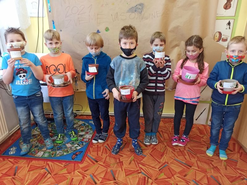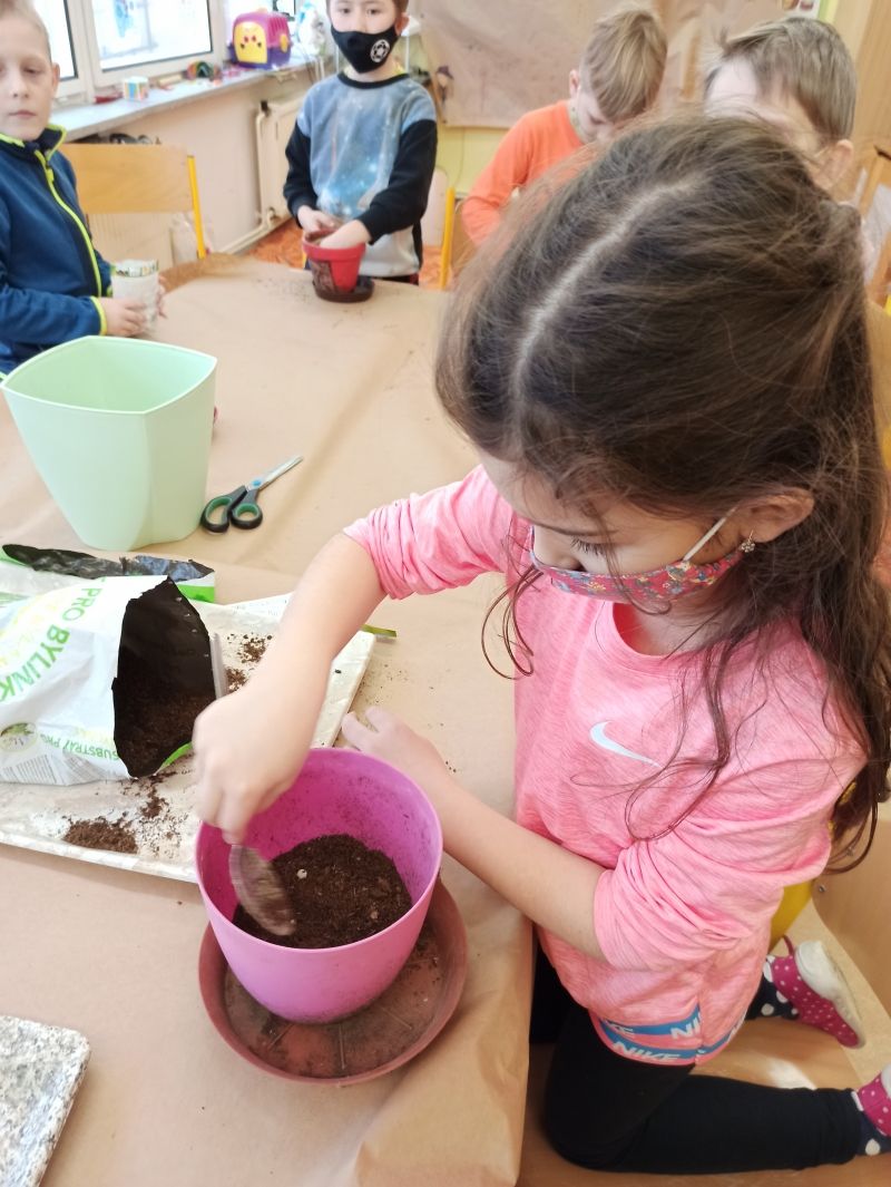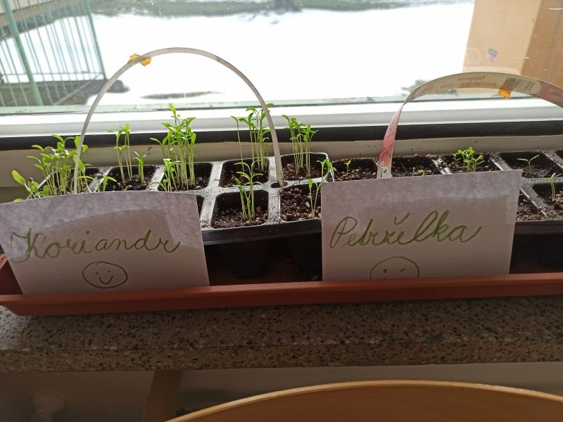 Děti tento týden sázely semínka hrášku, fazolí a zároveň se starají o nově vypěstované bylinky (například koriandr, pažitku, petržel, špenát atd.). Družinová zahrádka roste a zelená se včetně výhonků vína v květináči. V březnu se děti chystají nasadit na zahradě třešeň a jabloň. Všichni se už těší na jaro.