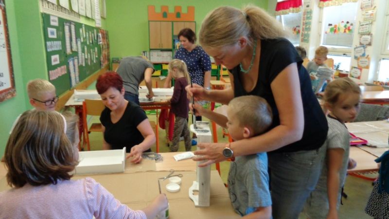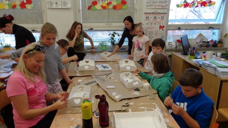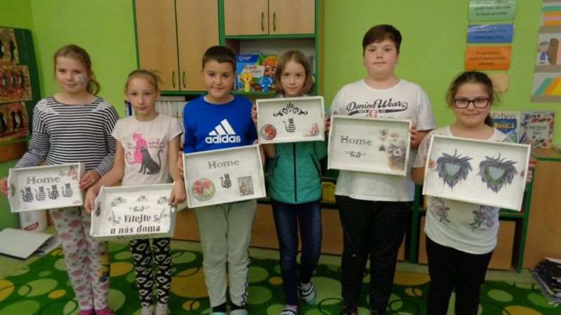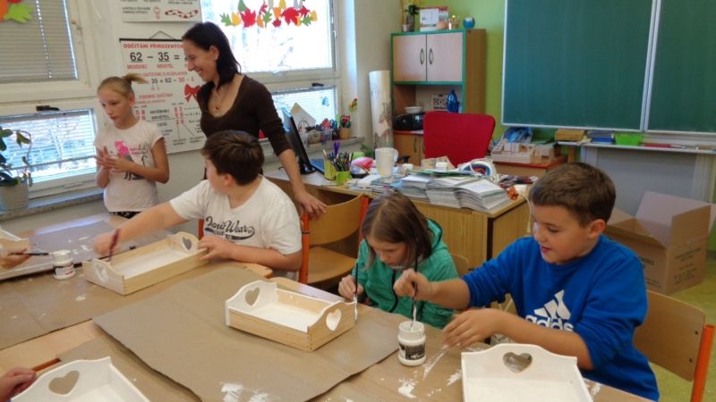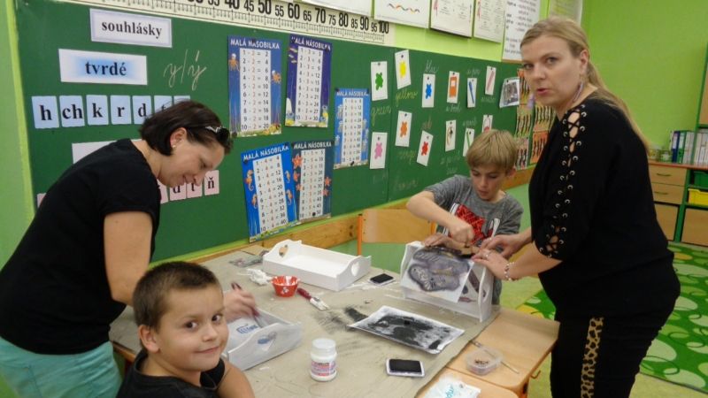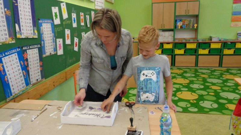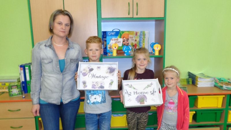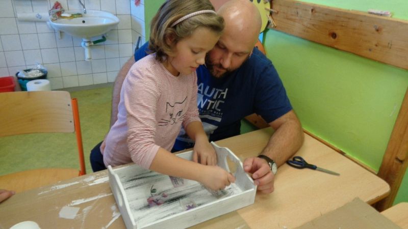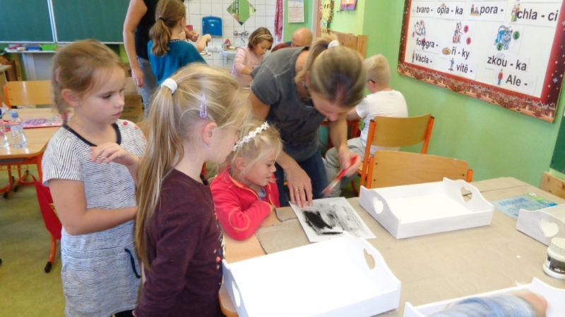 Letošní Tvoření pro radost jsme zahájili dekorováním dřevěných podnosů.Nejdříve si tácy všichni tvořílci (děti, maminky, tatínek i babička) natřeli bílou akrylovou barvou. Poté si je dozdobili ubrousky technikou decoupage nebo různými ornamenty či nápisy pomocí šablon.Nakonec vše zafixovali přelakováním . Domů si všechny děti odnesly krásné tácy na čaj či kávu.