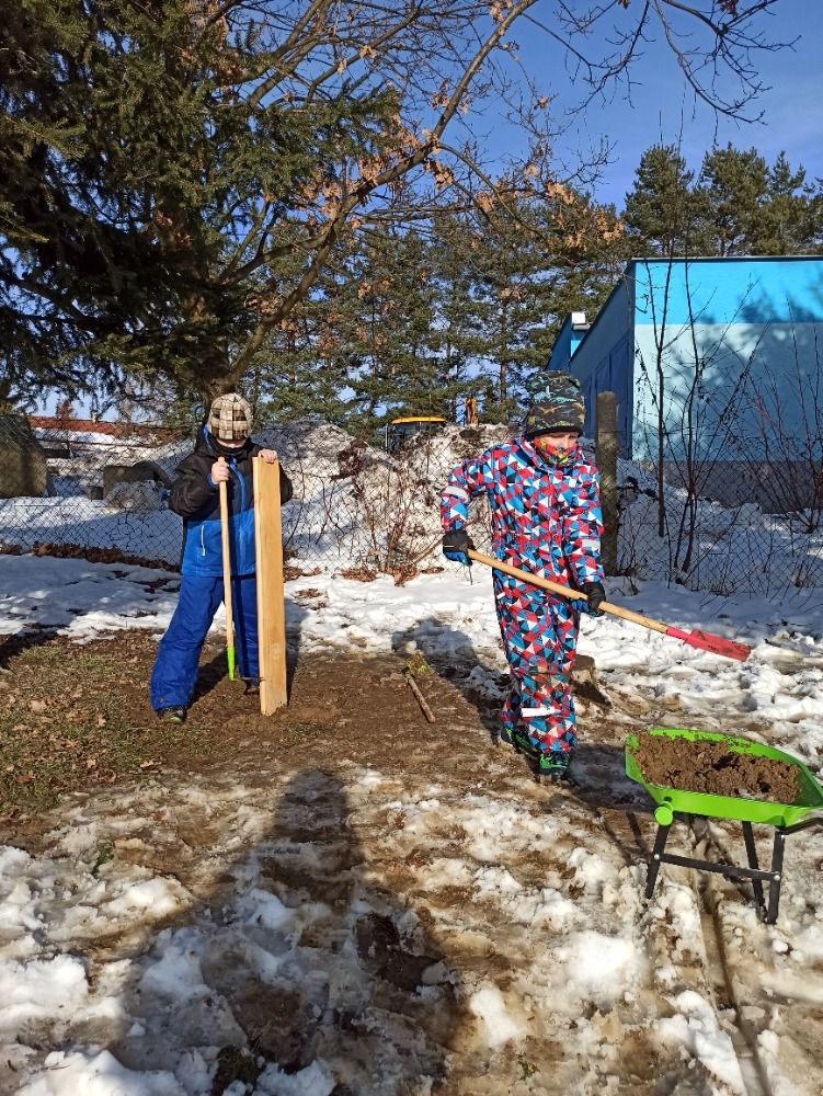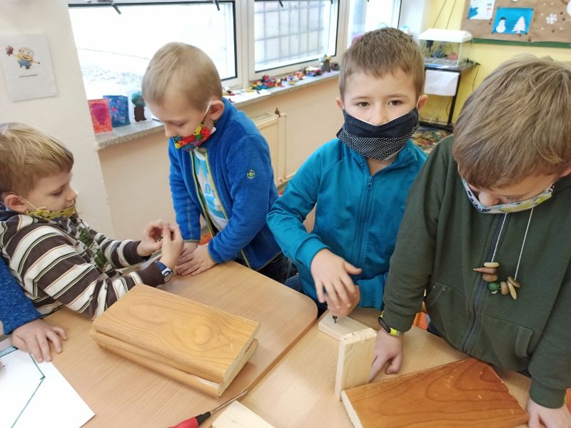 V družině s 1. třídou jsme minulý týden vyrobili nová dřevěná krmítka pro ptáčky na školní zahradu. Děti také vykopaly u školní zahrádky základny pro upevnění stojanů na krmítka, která následně připevnily a nasypaly zrní pro ptáčky. Zároveň doplňují ptačí zob do starých krmítek, rozvěsily lojové koule. Celý měsíc si malují do "Ptačího sešitu" různé druhy ptáčků, které poznávají a počítají na zahradě i na vycházce okolo školy.