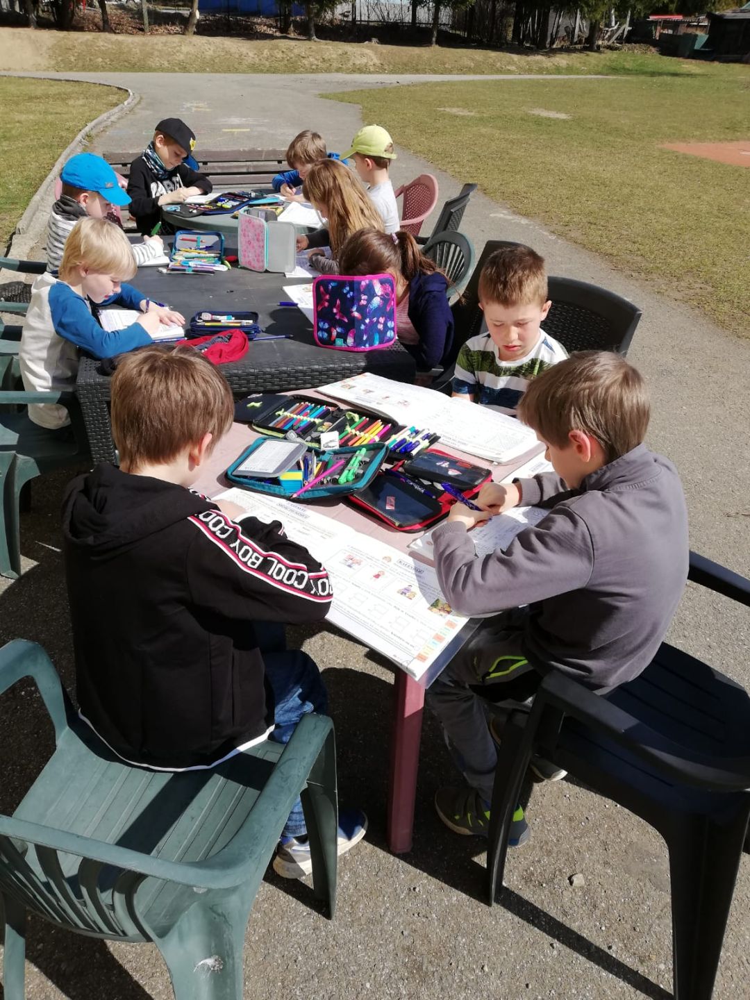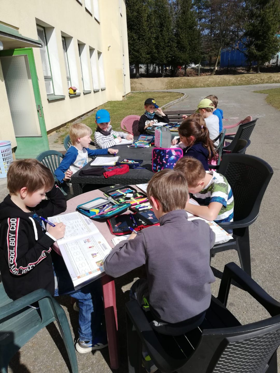 Krásné počasí využívají děti nejen k relaxaci, sportu a hrám o velkých přestávkách a v družině, ale dovoluje nám taky přesunout výuku některých předmětů do příjemného prostředí naší školní zahrady. Výuka je tak pro děti zase o něco zábavnější.