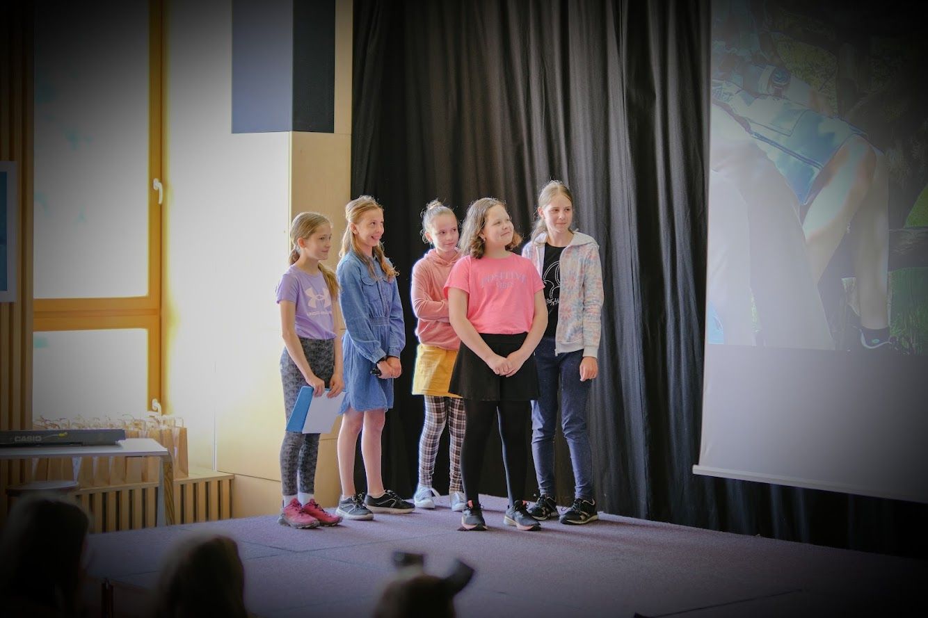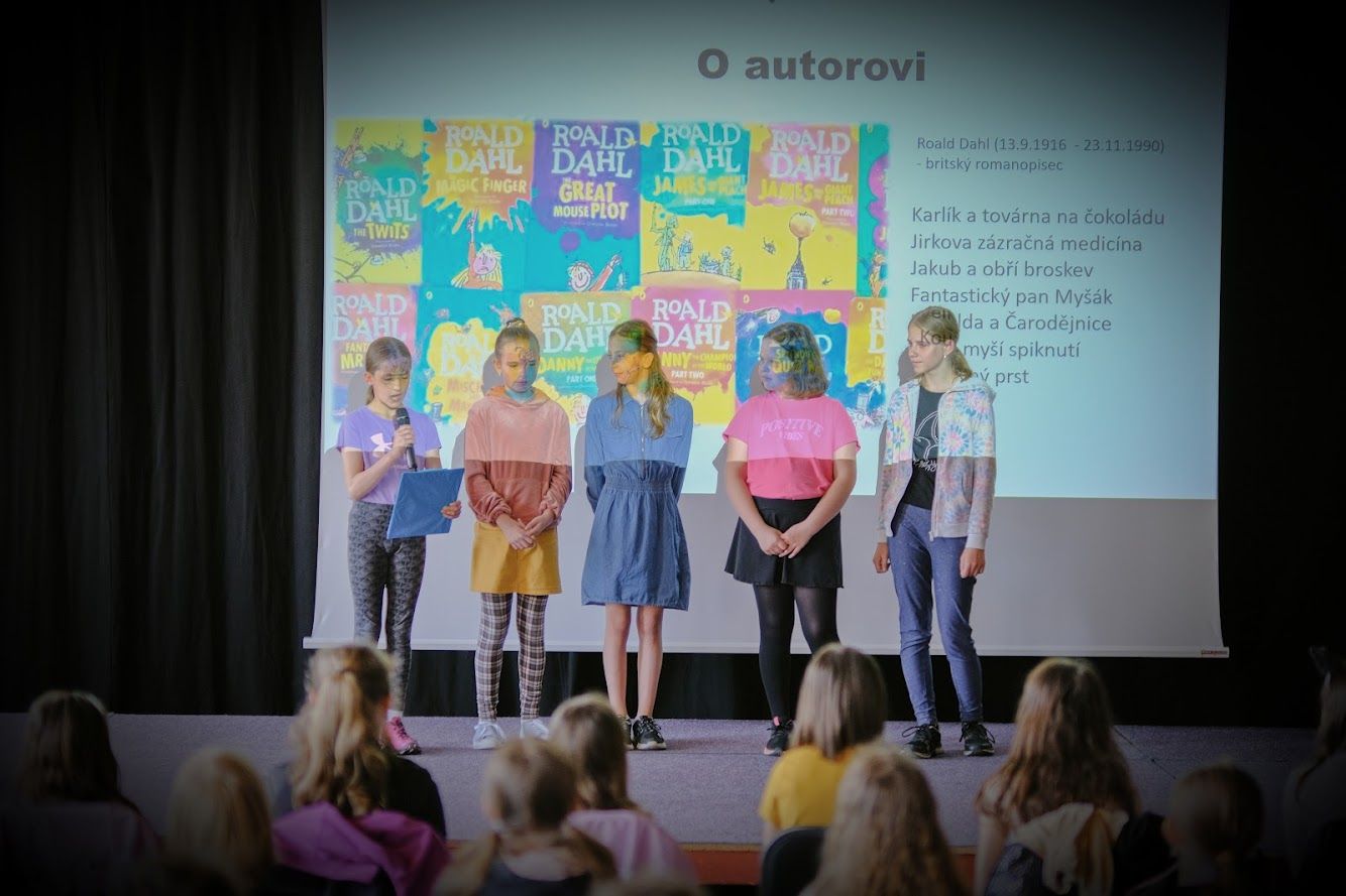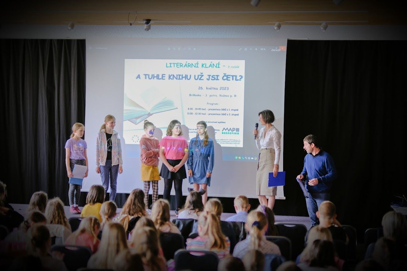 V pátek 26. května se žáci 4. a 5. ročníku zúčastnili již druhého ročníku akce na podporu čtenářské gramotnosti s názvem Literární klání. Skupinka pěti děvčat z naší školy představila svým spolužákům z různých škol z Rožnova a okolí knížku Prevítovi od spisovatele Roalda Dahla, kterou předtím dívky přečetly a líbila se jim. Dívky si připravily k této knize prezentaci a natočily krátkou scénku. Zároveň jsme shlédli prezentace šikovných žáků dalších sedmi škol, kteří zajímavé knížky představili formou dramatizace, animace, písně apod. Naši žáci tak byli nadchnuti do dalšího čtení.