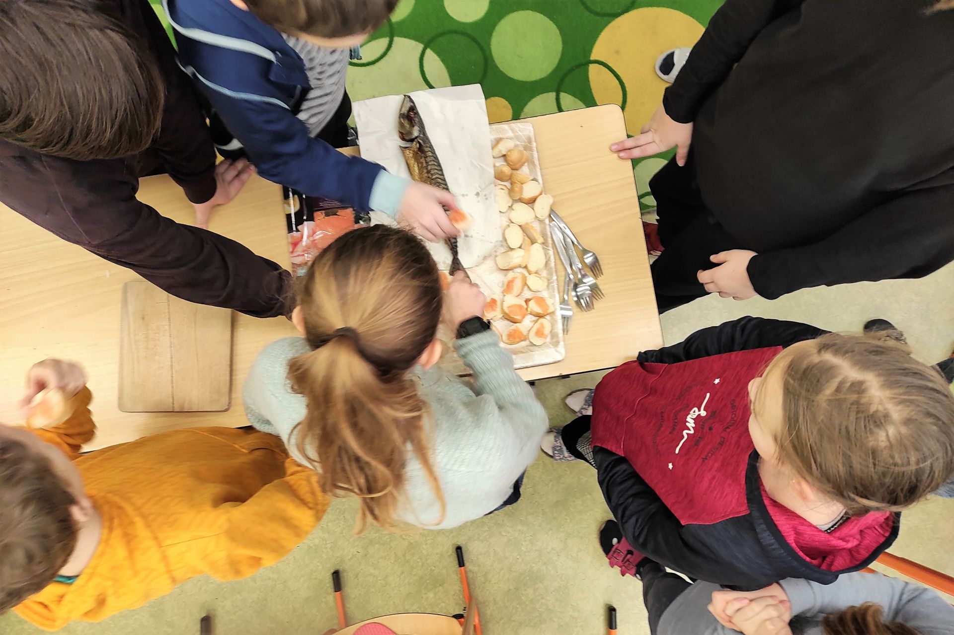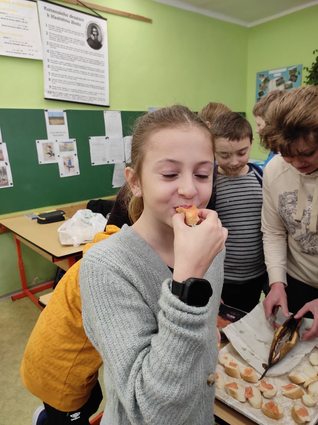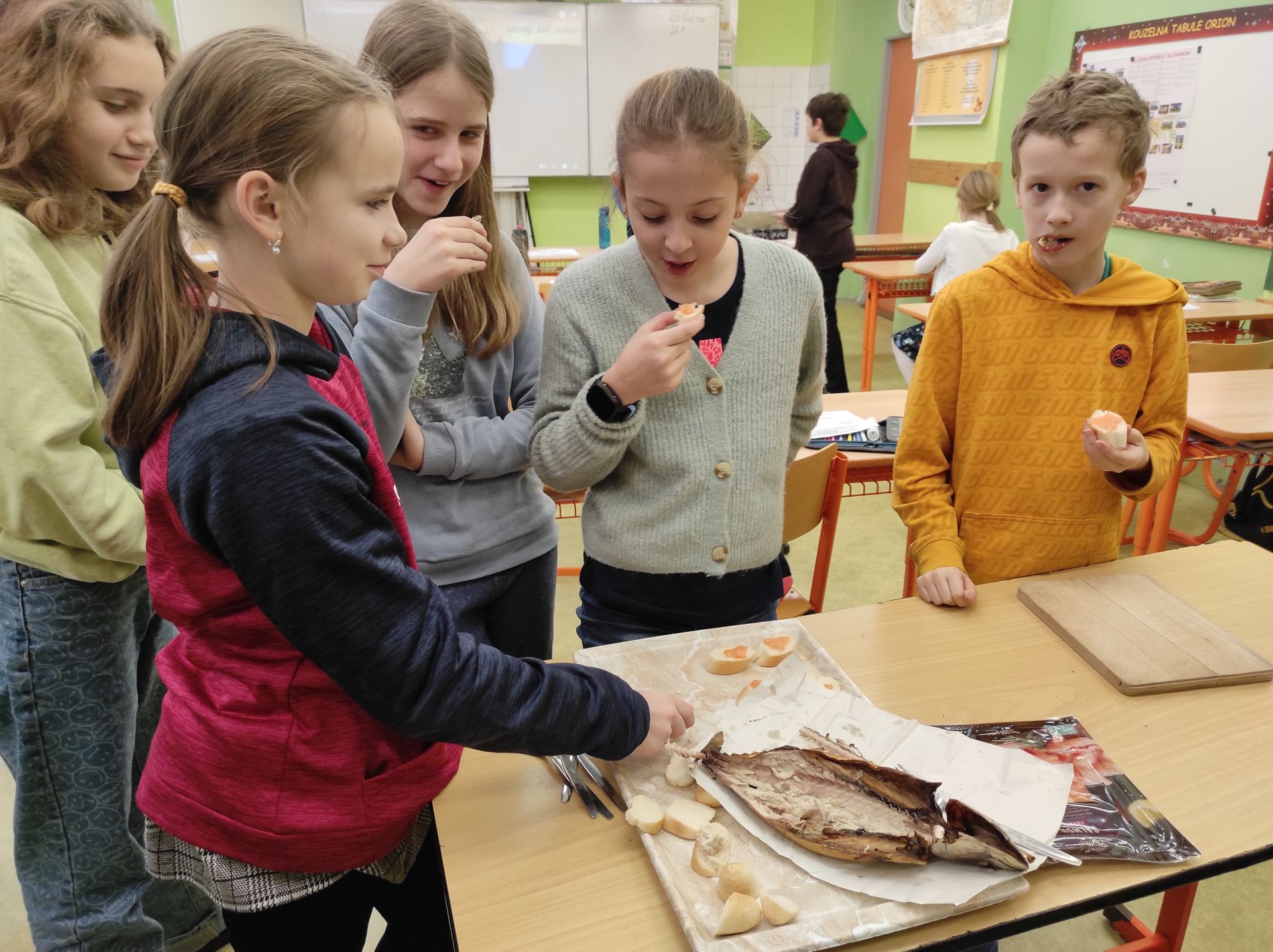 Hodina přírodovědy v 5. ročníku byla zpestřena návštěvou supermarketu Albert (nabídka mořských ryb) a ochutnávkou lososa a makrely v rámci tématu Moře a oceány.