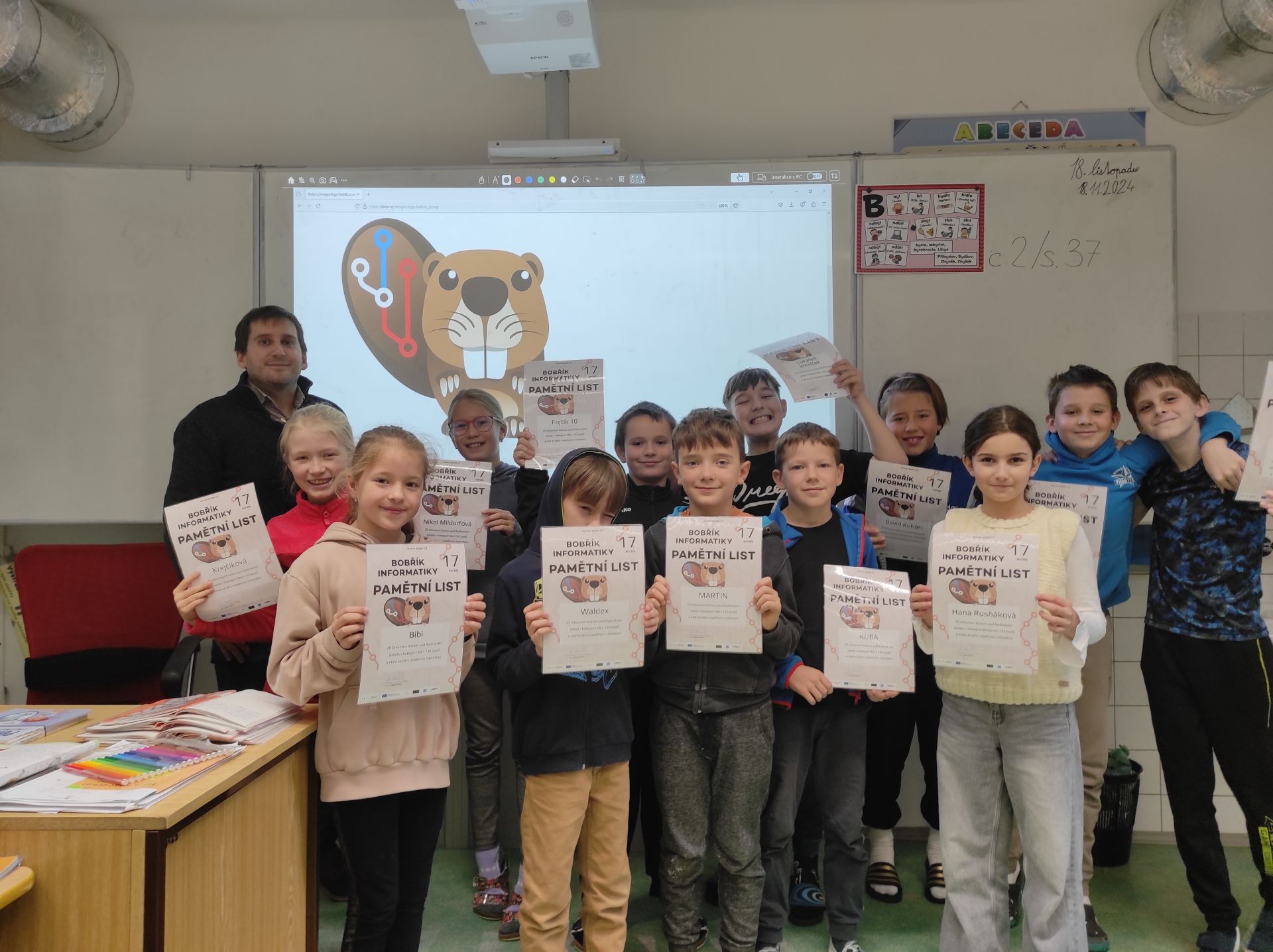 V týdnu od 11. do 15. listopadu se žáci 3. - 5. ročníku zúčastnili informatické soutěže pro žáky základních a středních škol s názvem Bobřík informatiky. Celkem 12 účastníků se stalo úspěšnými řešiteli - v kategorii Mini 4 žáci třetího ročníku a 4 žáci čtvrtého ročníku a v kategorii Benjamin 4 žáci pátého ročníku. Všem úspěšným účastníkům gratulujeme.