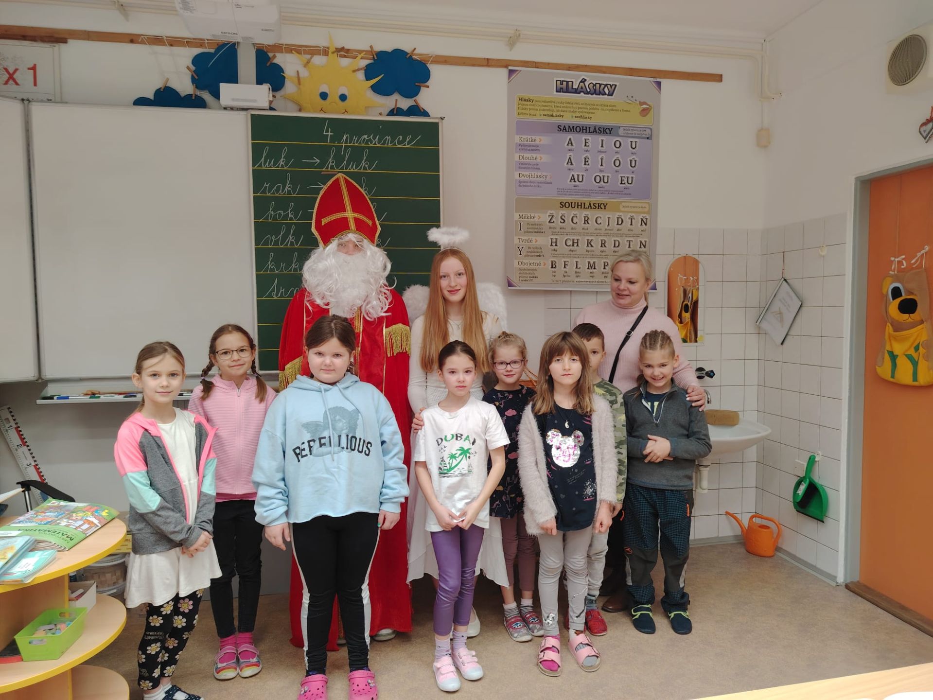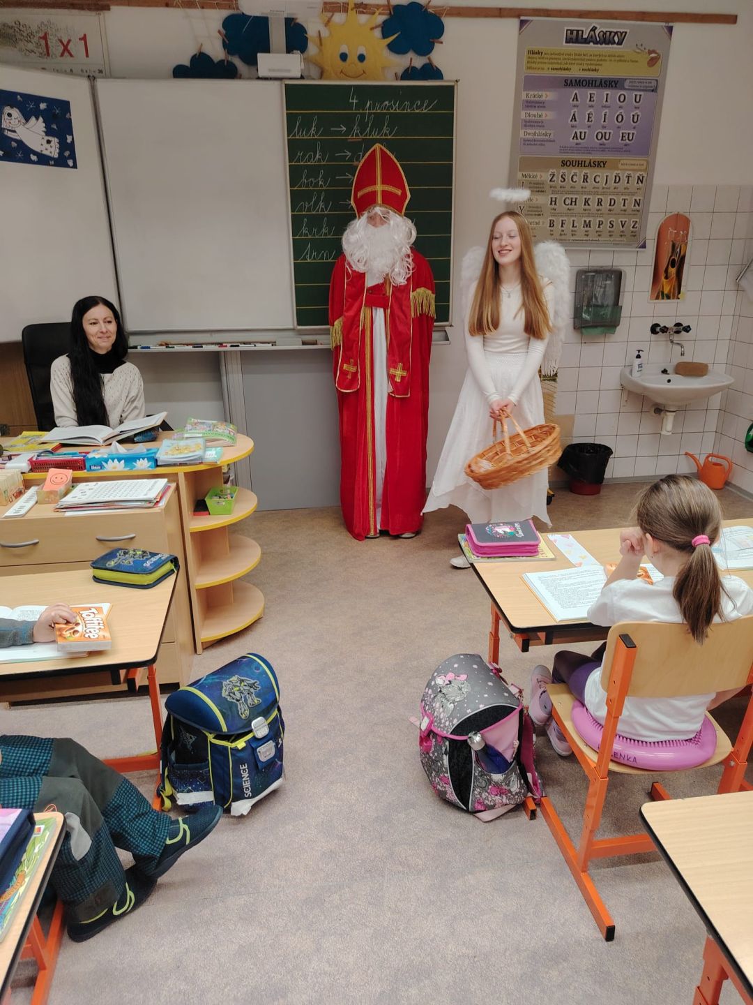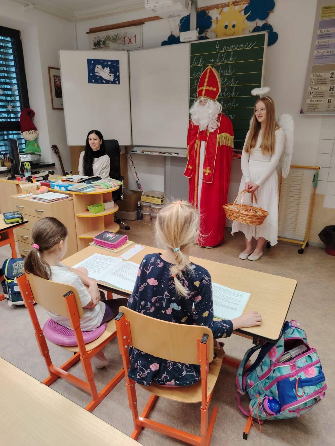 Domů Fotogalerie 2024/2025Svatý Mikuláš naděluje s andělem u druháčků