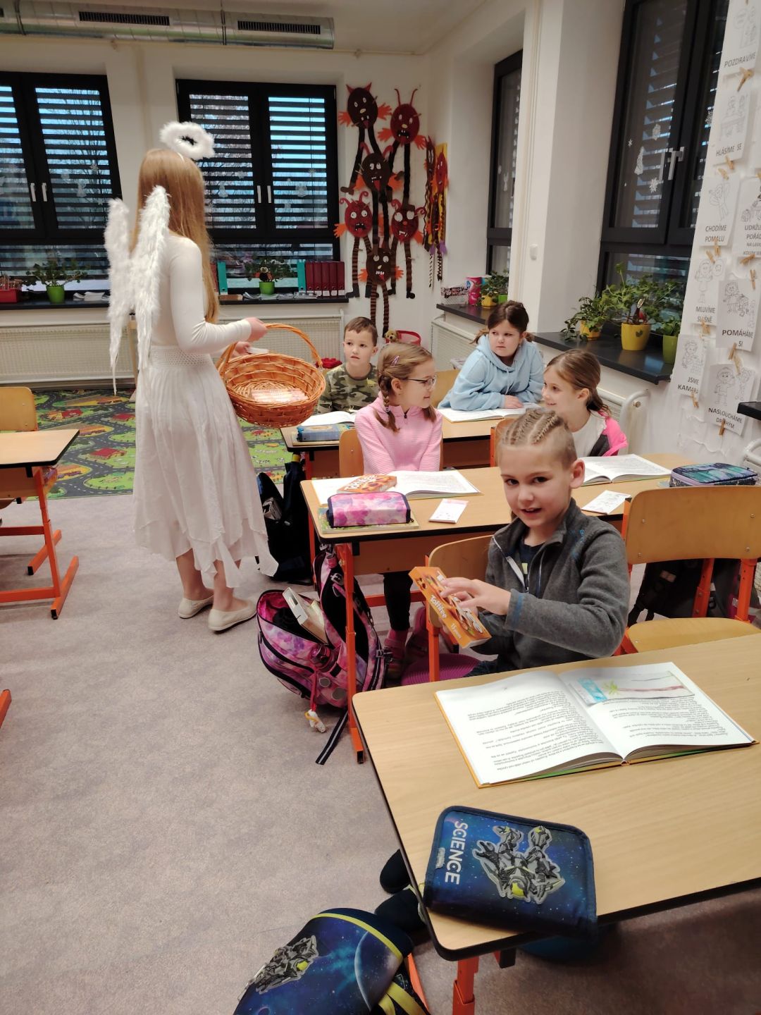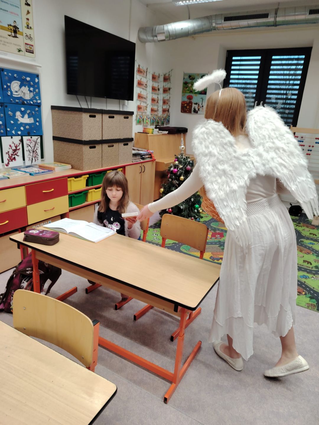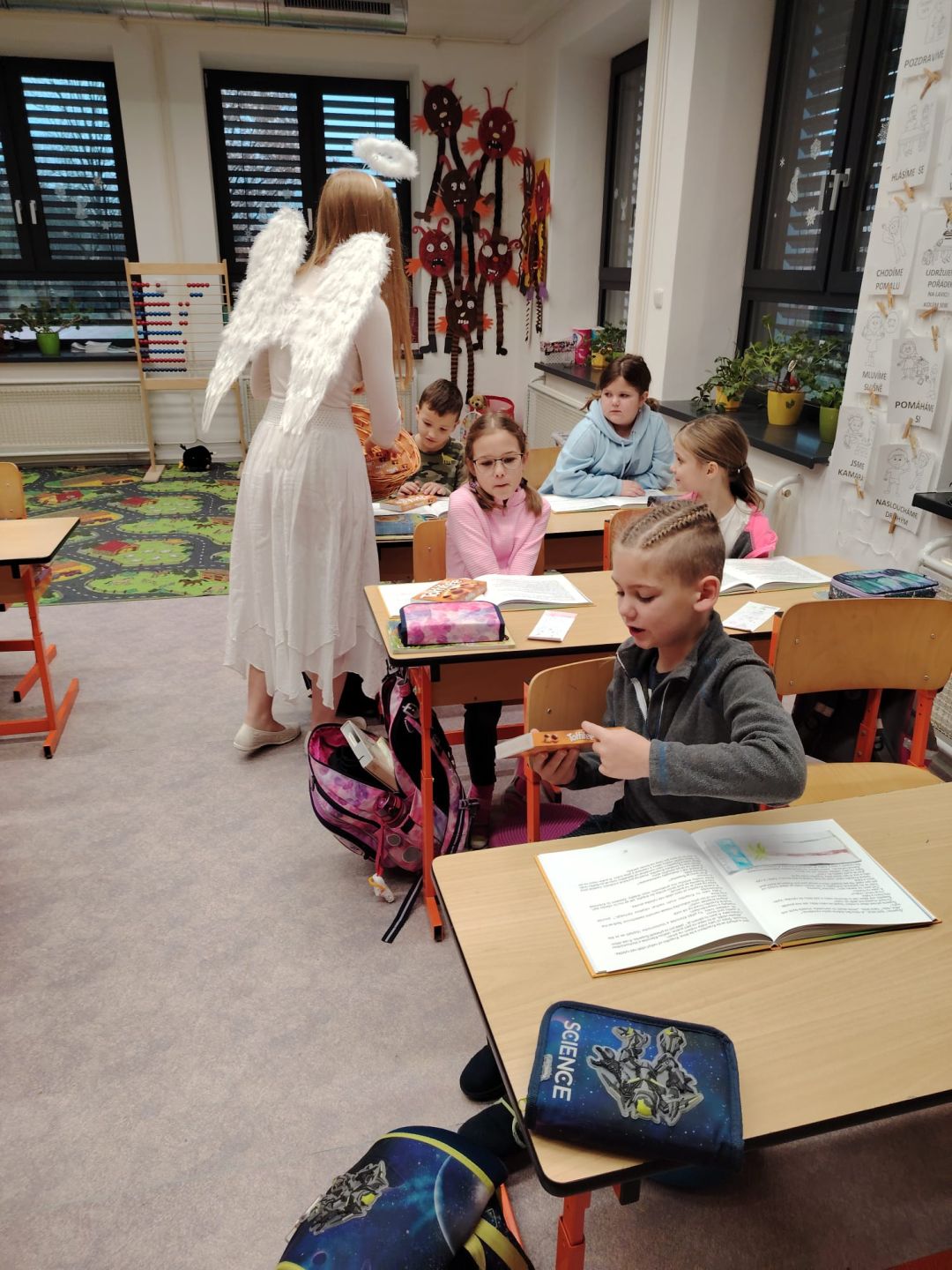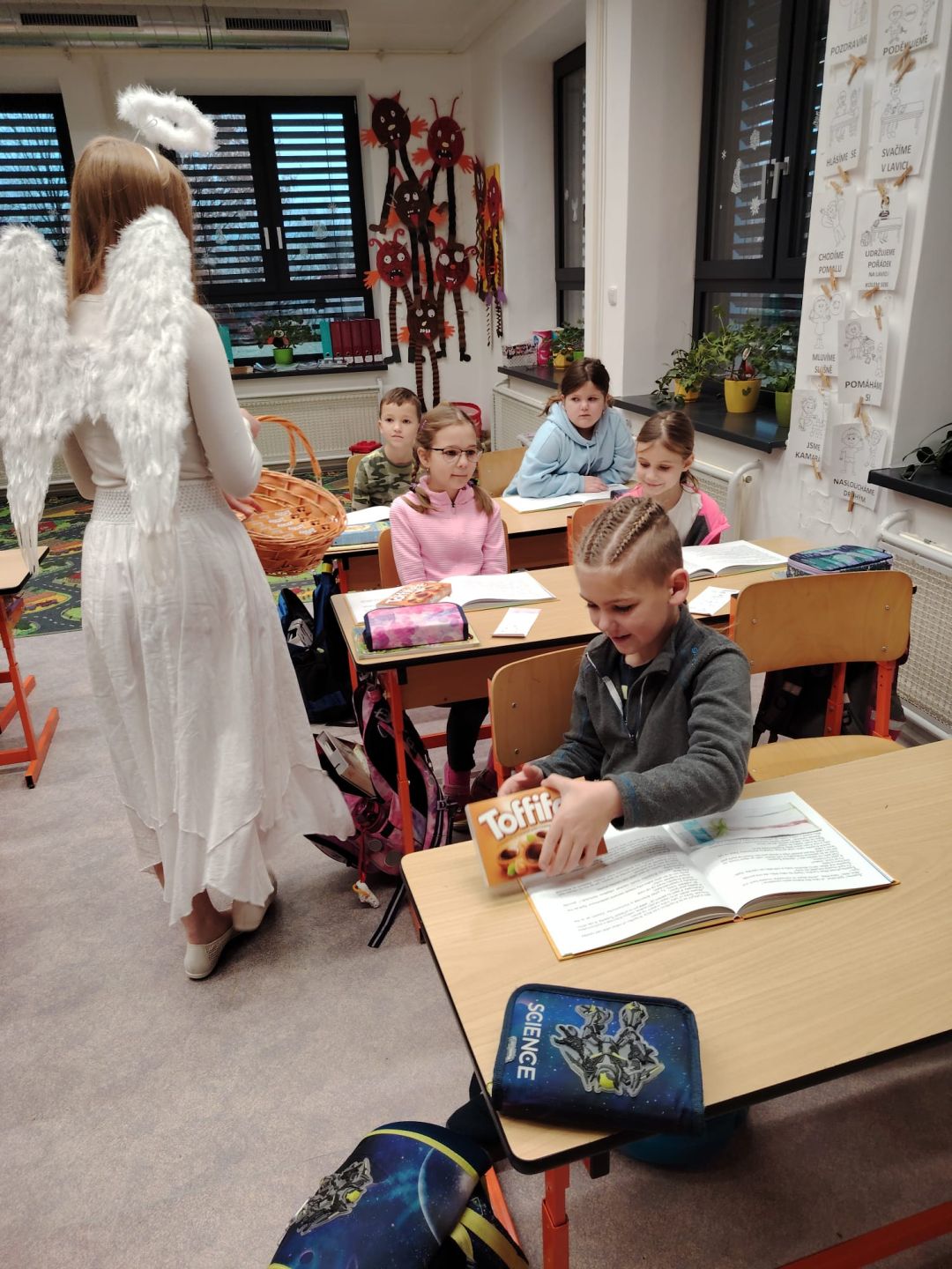 Domů Fotogalerie 2024/2025Svatý Mikuláš naděluje s andělem u druháčků